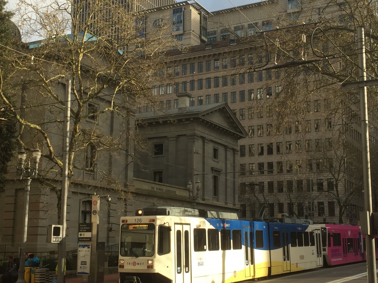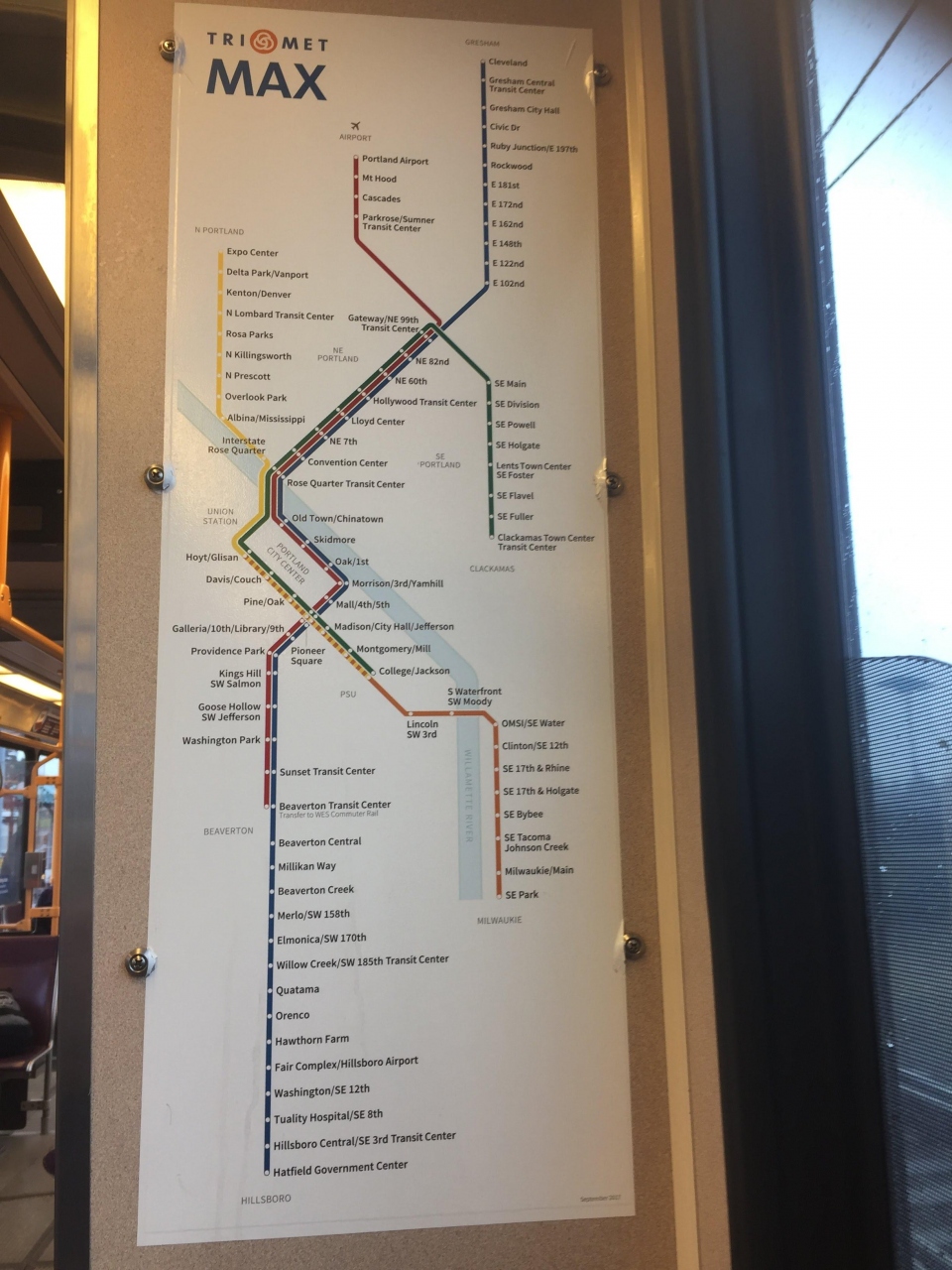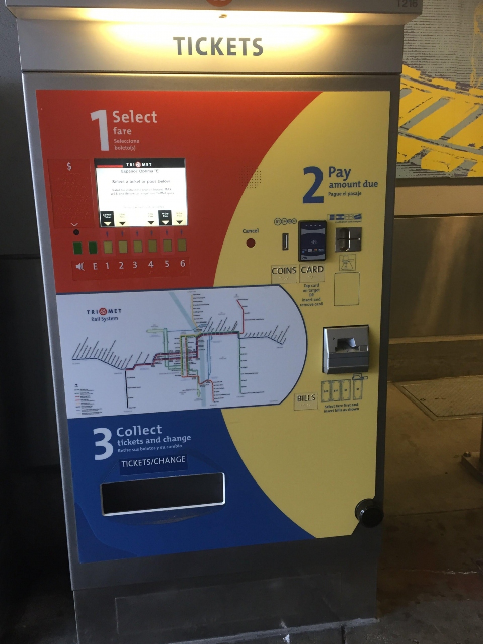 空港で手続きを終え、レッドラインに乗ってダウンタウンに向かいました。外に出ると大きな看板が有って一目瞭然。空港からはレッドラインだけなので、乗り間違えもありません。空港の券売機はカードオンリーとキャッシュで買えるものと2台有りました。買い方もとてもわかりやすいです。場所によってはカードしか使えない機種もあります。車内には路線図も有るし、電光の表示も出るのでわかりやすいです。バスやストリートカーとチケットが共通。一日券も有るのでお得です。乗るときも降りるときも改札はありませんが、抜き打ちチェックがあります。一度だけ、空港近くの駅で降りた人のチケットをチェックしているところを見かけました。歩道が乗り場になっているので待っている人の後ろを通行人が通ります。改札を通ったりホームまで階段を上ったりしなくてよいのでとても楽です。乗り場のポールには行先のカラーが表示されていて、何分後にどのラインが来るかも表示されます。滞在中何度も乗りました。