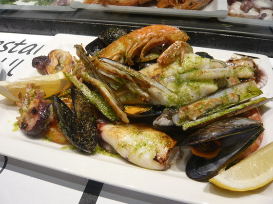 ンタカタリーナ市場の中にあるバルの一つです。ガラスケースの中には美味しそうな鮮魚が。