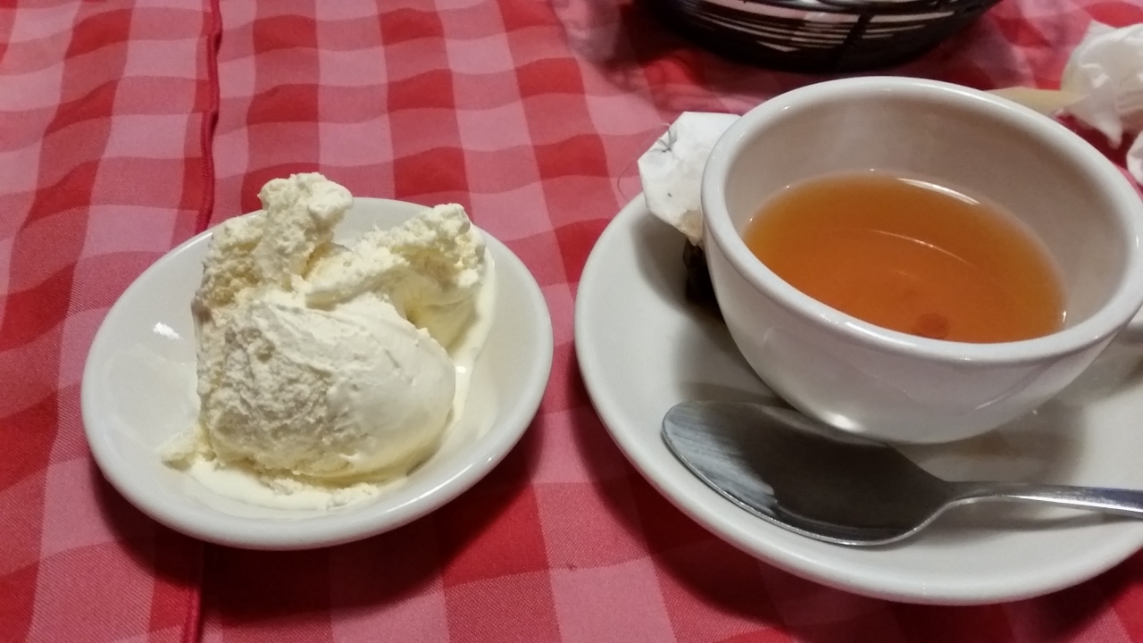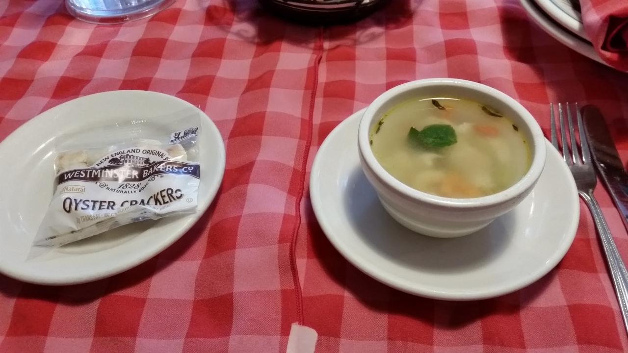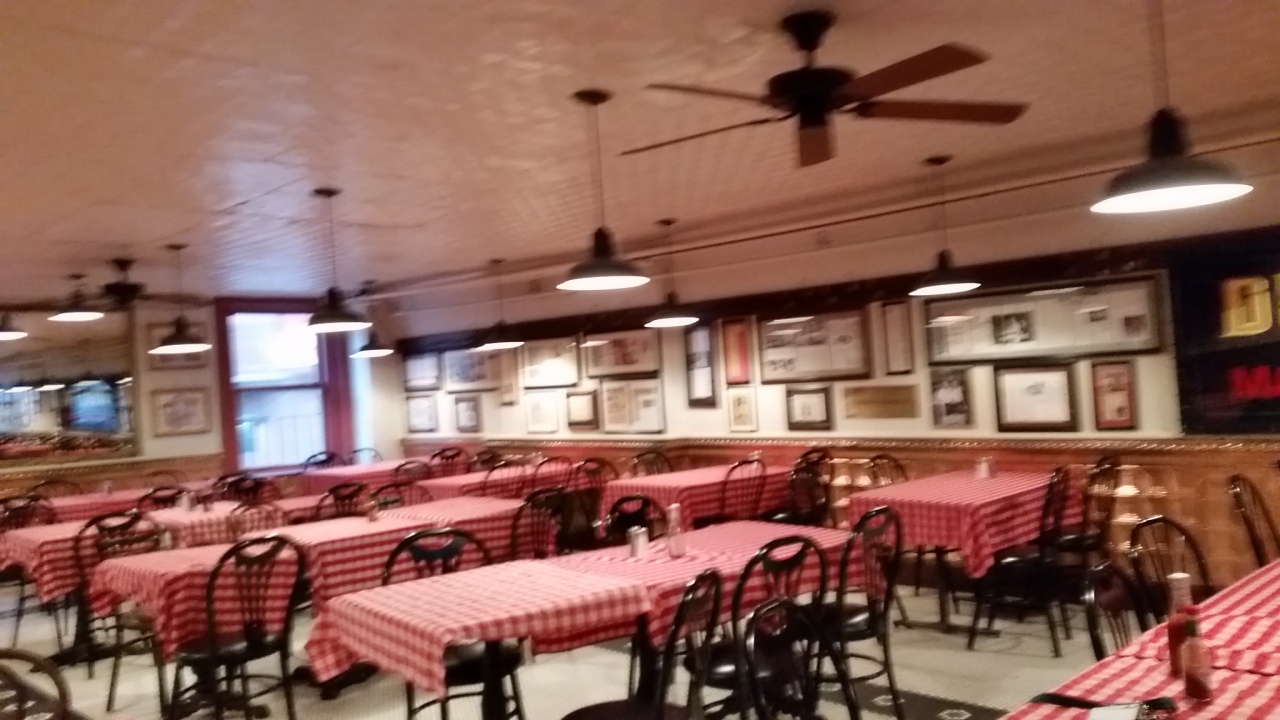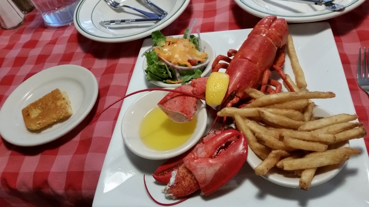 ツアーの最後の晩餐で訪問しました。クインシーマーケットの2階のレストランです。ツアー客全員、赤と白のチェックのナプキンを首に巻かれました。メニューはスープ。クラッカーを入れて頂きました。一人一匹のロブスター。溶かしバター・レモン・サラダ・ポテト。アイスクリームと紅茶。殻を割って切るパンチのような物と小さなフォークは配られましたが、蟹スプーンが欲しかったです。料理は美味しかったです。