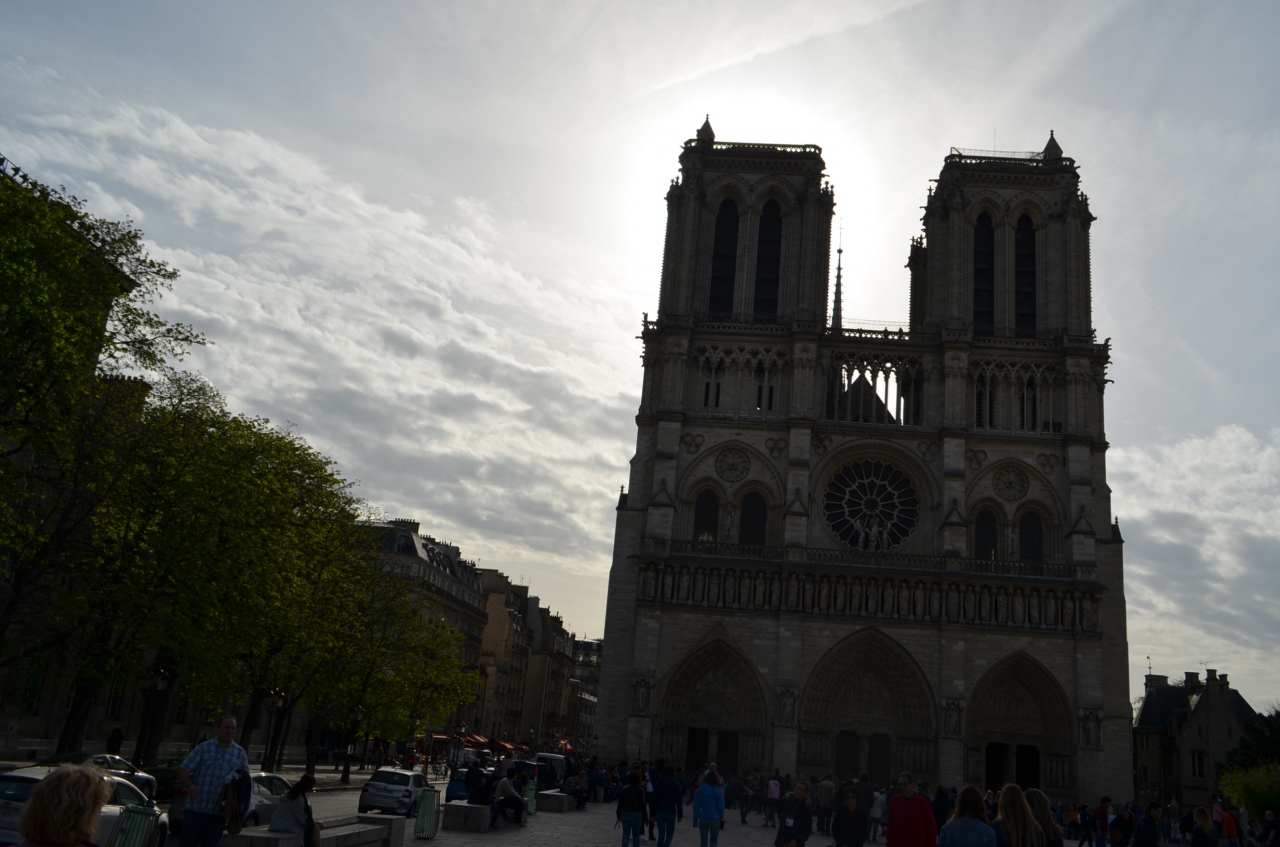 初めてパリ見物をするなら、お上りさん鉄板の名所、ノートルダム大聖堂編です。簡単な荷物検査があるので、行列が出来ています。外から見ても壮観ですが、中に入ってみるとステンドグラスが息を呑む美しさです。中が広いので、ゆっくりと一時間ぐらいかけて拝観しました。門前には土産物屋さんが軒を連ねています。