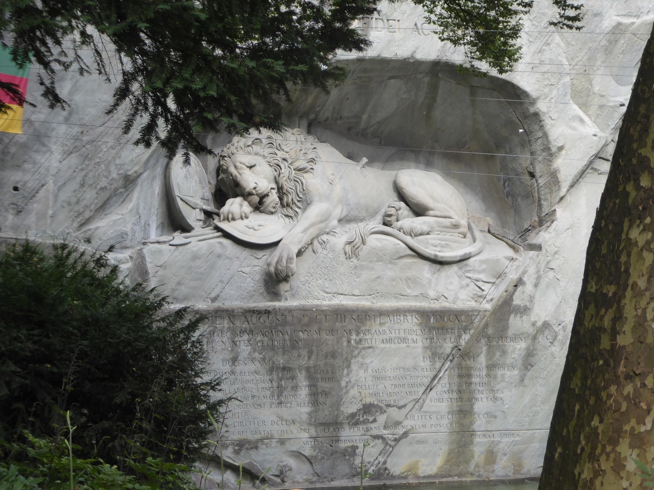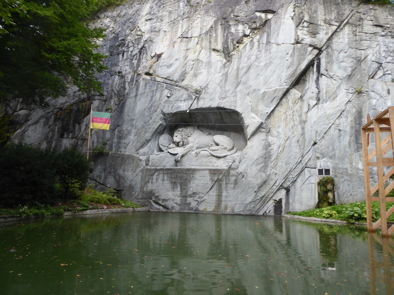 ルツェルン旧市街東側で、カペル橋から徒歩で10分程の距離にあります。小さな公園の中に池があり、池の向こうが岩場で、ライオン像は岩場にレリーフ状で彫られています。悲しそうな表情をしたライオンが印象的です。フランス革命の時にブルボン王家を守っていたスイス傭兵が非業の死を遂げたのを偲んで創られた記念碑です。