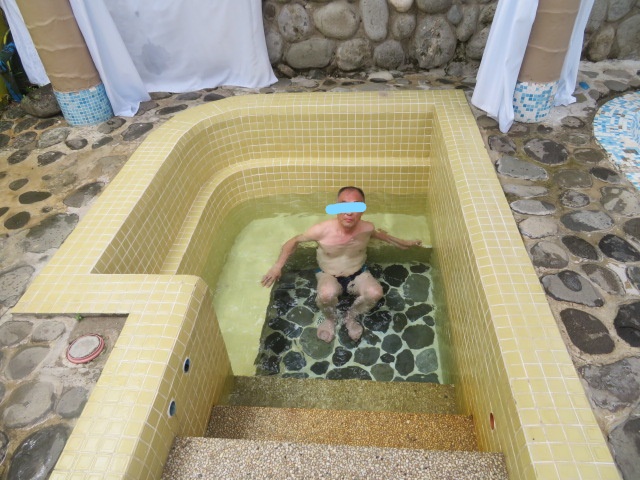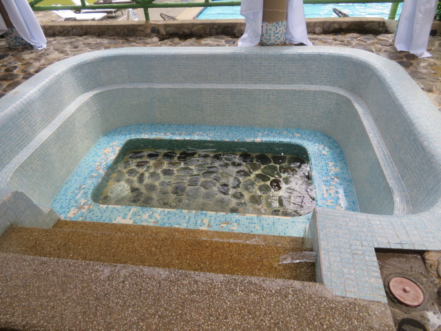 バギオのシティマーケット付近のカヤン通りからジプニーに乗って山道を1時間位移動した集落にある温泉で、レジャー施設のパームグローブ温泉の敷地内にある浴槽で温泉を楽しんできました、大きな温水のレジャープールの上にいくつかのタイルと石でできた浴槽がありました、そのうちの一つを貸切で利用、かなり熱いお湯を水でうめて入りました、何人も入っている人がいました、一人で入っていたのは私だけでした。