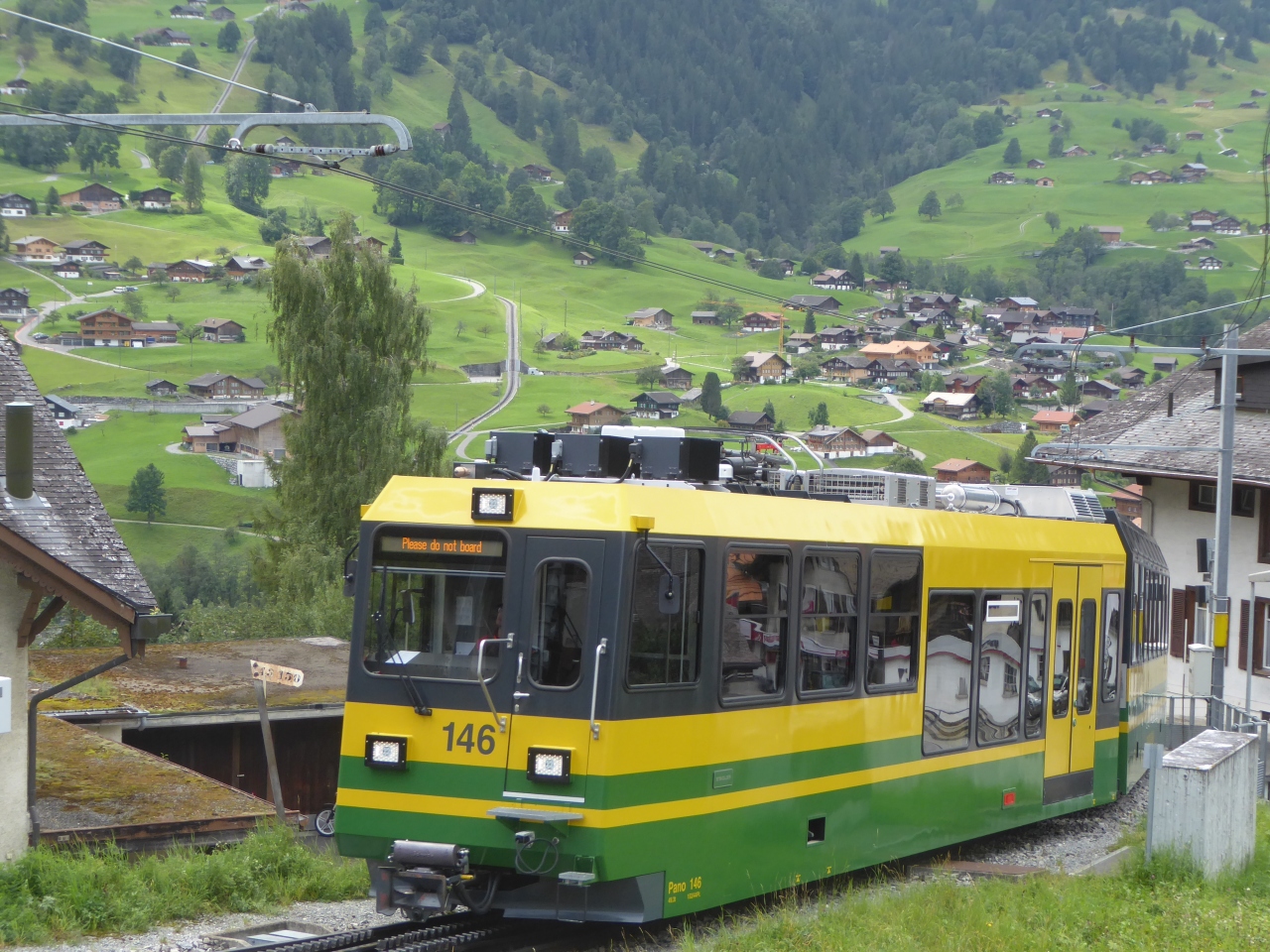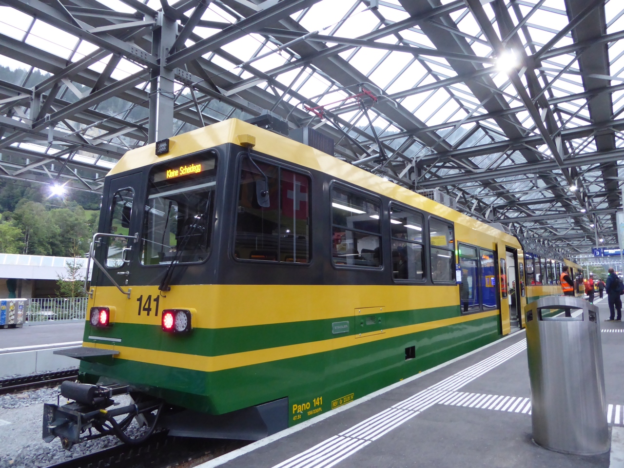 クライネシャイデックからグリンデルワルト駅に移動するのにこの鉄道を利用しました。ラックアンドピニオン方式の山岳鉄道で、かなり急峻な勾配を走っています。沿線には放牧された牛やスイスらしい山小屋などの景観が広がっていました。