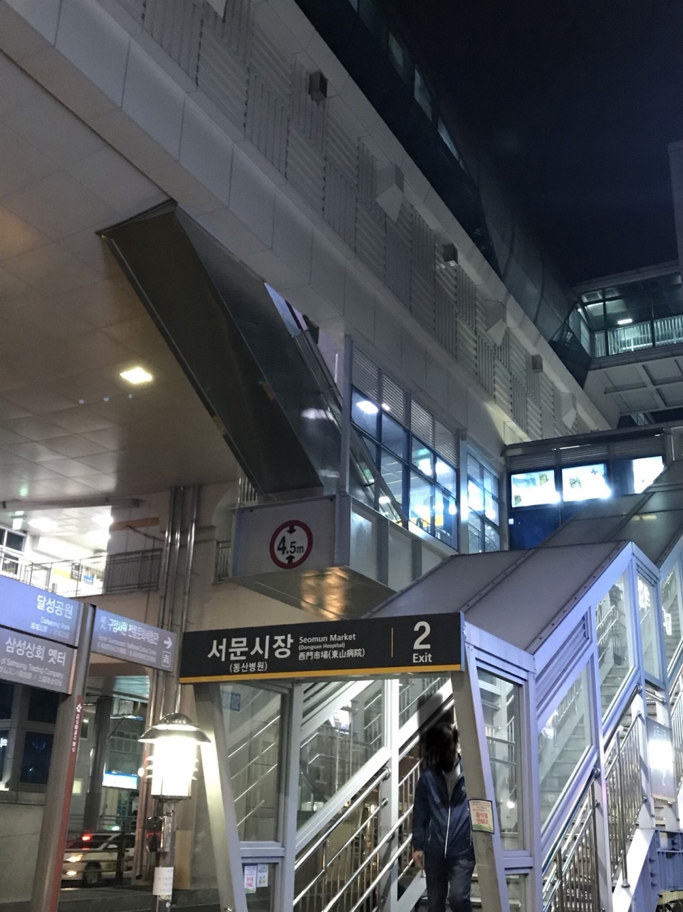 韓国・大邱の地下鉄の駅です。地下鉄の駅と言いつつ、地上を走っています。モノレールのように車道の上を走っているような感じです。大邱の台所・西門市場は、この駅から歩いてすぐなので、場所もとてもわかりやすいです。