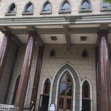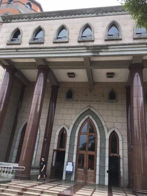 英国領事館の裏側に真理大学への抜け道がありました。ちょうどこの礼拝堂のあたりに出ました。一般公開も時間を限って行っているようでしたが、ちょうど時間が悪く中に入ることはできませんでした。視線の先に見えるレンガ色の大書院と対比すると、こちらはシックな感じの建物でした。