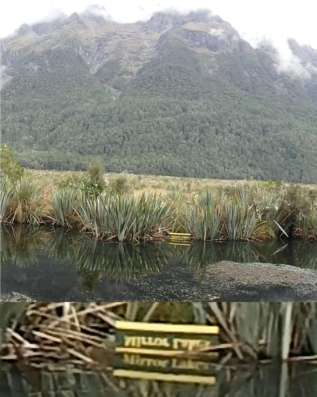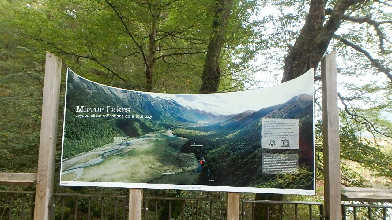 湖岸には「Mirror Lakes」の逆文字の小さな看板があり、湖面に正位置に映るような仕掛けになっています【写真参照】。