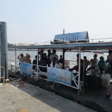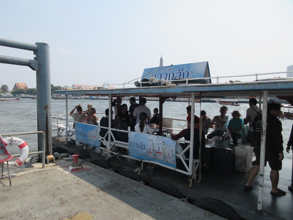 ワット・ポーとワット・アウンは、チャオプラヤー川を挟んで対岸に位置するので、渡し船に乗って移動することになりました。桟橋は日とっが歩く度に揺れて、アスレチックジムで遊んでいるような感覚で楽しめました。船は走り出すとあっという間、5分ほどで対岸に到着しました。