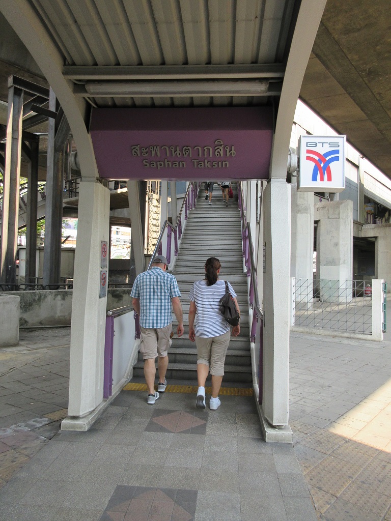 この日はワットアルンの船着き場からチャオプラヤエクスプレスに乗り、サットンで下船。そこから表示に従って、数分あるくとBTSシーロム線の駅の一つであるサパーンタクシーン駅に到着しました。もっとも標識など見なくてもこの船着き場を利用する殆どの観光客はこちらの駅に向かうので、迷うことはないと思います。エスカレーターではなく階段で改札まで上がらねばならないのが、少し応えました。