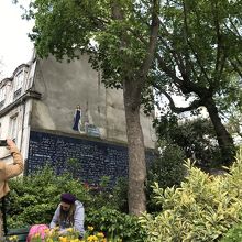モンマルトルの中腹にある小さな公園の中にあります。前には教会があって広場になってます。緑の中に濃青の壁があらわれて、観光客も多く、みなさん手をつないだり抱き合ったりして写真におさまっていました。スペースも小さいのでごったかえしてます。