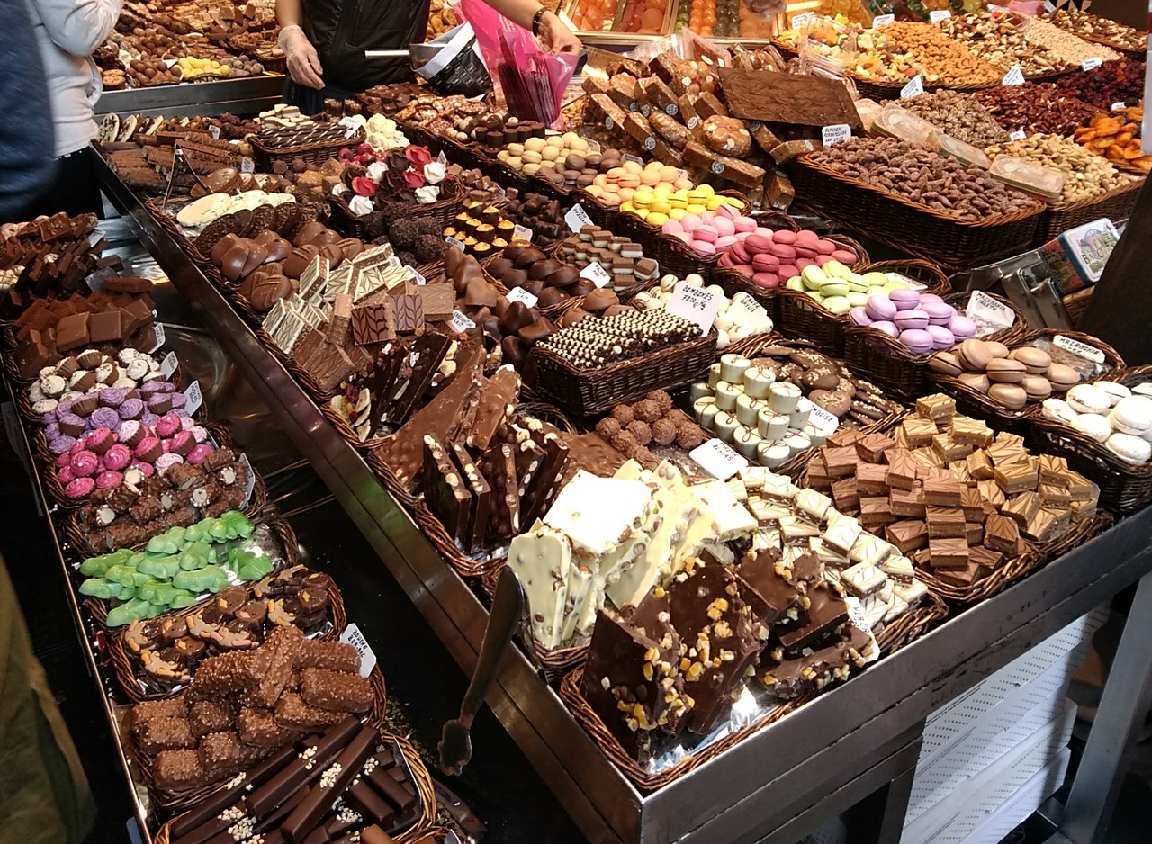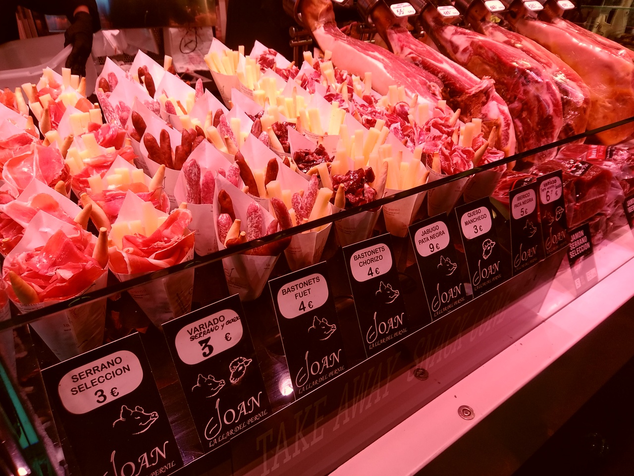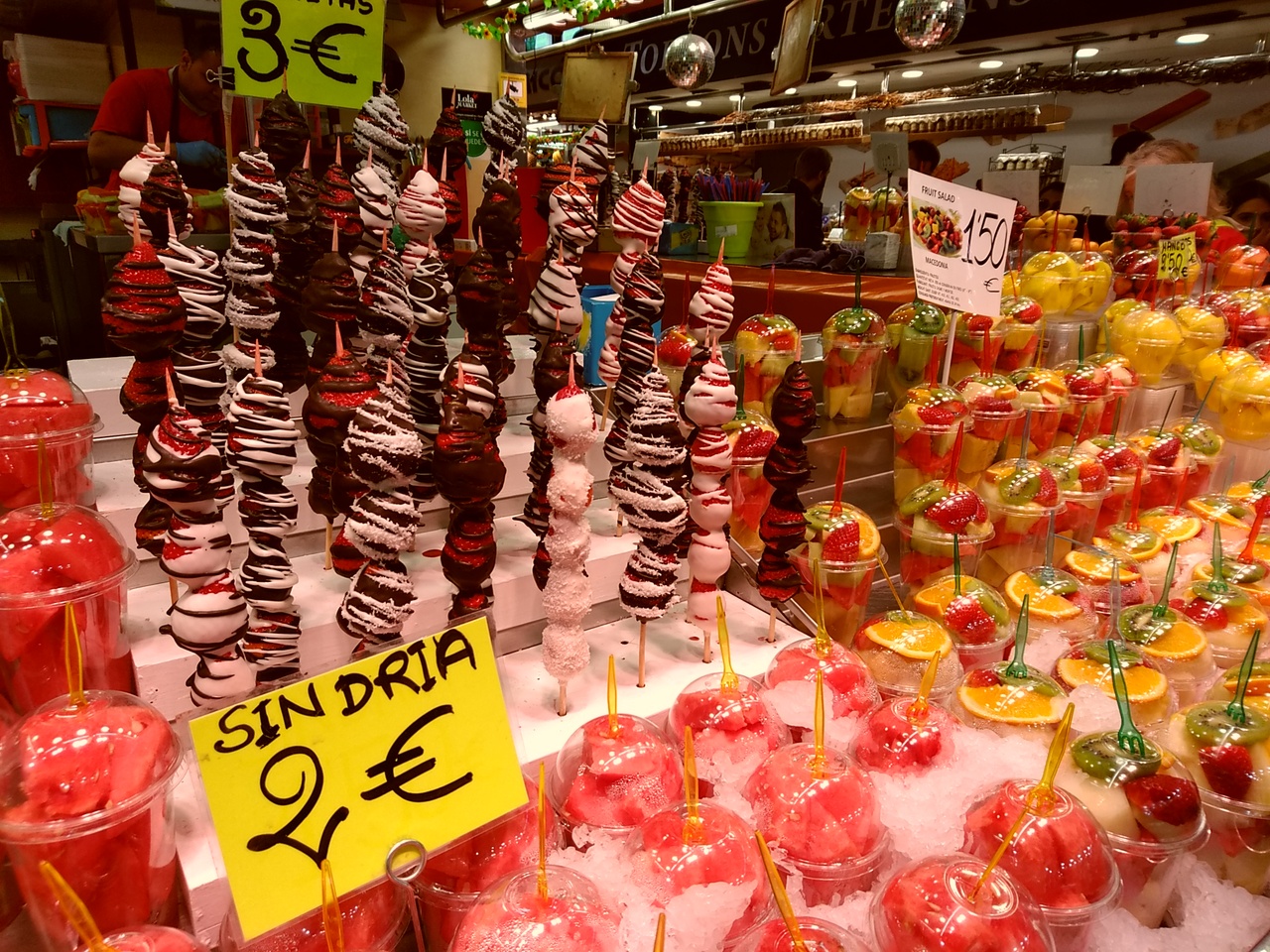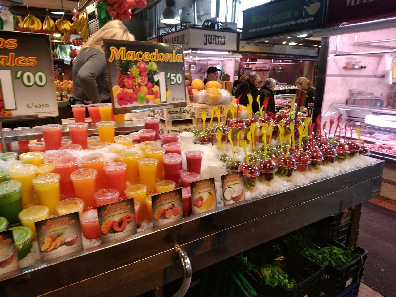 とにかく見てるだけで楽しい!肉、魚、果物、チョコ、なんでもありますね。お酒が飲める小さなBALも入ってますが、常に満席。生ハムや果物ジュース、揚げ物など食べ歩きできます。ジュースはお店によっては多少お値段が違うので、安いお店を探すのも良いでしょう。次回はキッチン付きの宿に泊まって、市場で買った肉や魚を自分で調理したいなぁ~