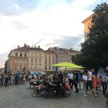 リヴィヴの風情を代表する光景で、中心にある建物が市役所で、ツーリストインフォメーションもここにあります。また各種土産物などの露店も出ています。