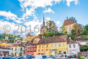 世界遺産「シギショアラ歴史地区」のある旧市街の丘のすぐ下を通る大通りです。ここから見上げるシギショアラ歴史地区の景観が素晴らしいです。カラフルな古い建物の奥に、シギショアラ歴史地区のシンボルである時計塔が顔を見せます。