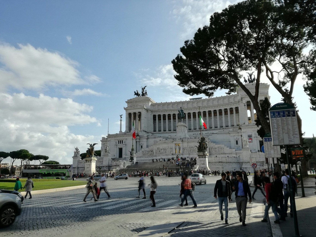 ローマで観光する予定のなかったところですがバスの乗り換え、そしてどこがでお昼ご飯を食べるためにヴェネツィア広場に立ち寄りました。路線バスに乗っていると突然白い建物が!なんだろうと思っていましたがその場ではわからず。あとで調べてわかりました。国旗も掲揚されていていい雰囲気でした。