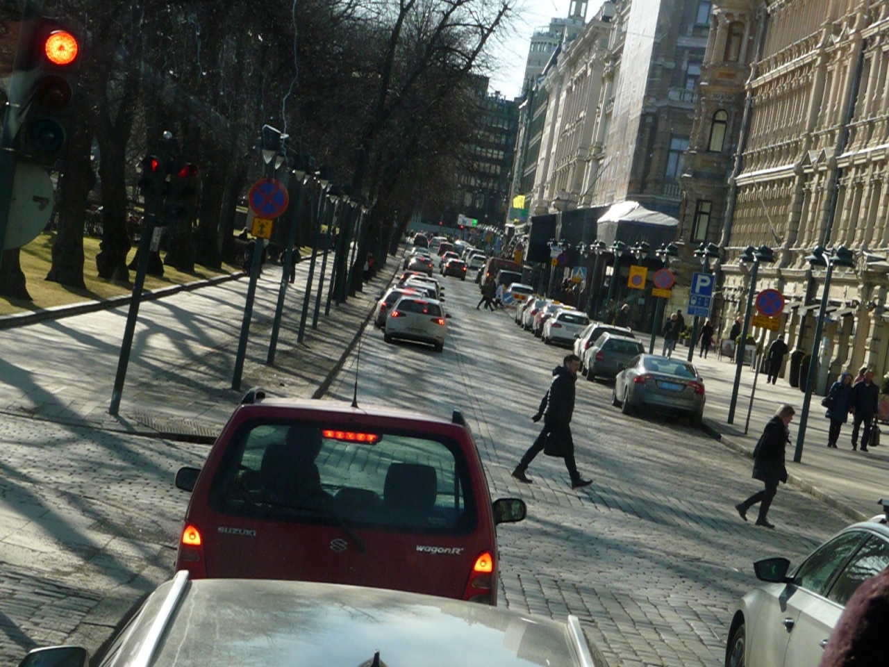 マーケット広場から西方向へ貫く大通り。中央分離帯部分に400mほどにわたり緑にあふれるエスプラナーデイア公園が設けられ、これがこの通りの雰囲気をよくしており、ヘルシンキ一番の繁華街となっている。ゴチャゴチャ感がなく、ゆったりした感じで、百貨店・有名店・カフェレストランなどが立ち並び、散策にはもってこい。