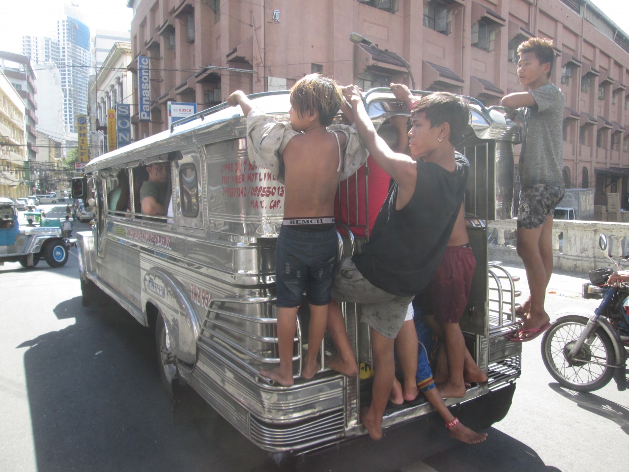 マニラの市内を走行しているジプニー座席があふれると、ローカルの人たちは立って乗車していました。さすがに、写真のような状態になっていると次のジプニーを捕まえます。日本では交通違反ですが、フィリピンでは許されており人気の移動手段でした。