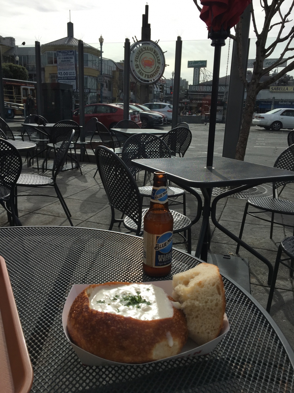 クラムチャウダーは大きなサワードブレットをくりぬいた中にたっぷりと入っており、途中でお腹いっぱいに。それを見越して、鳩や雀が周りに寄ってきます。彼らに手伝ってもらって完食。ありがとね。(彼らはかなりのデブちんでした。)