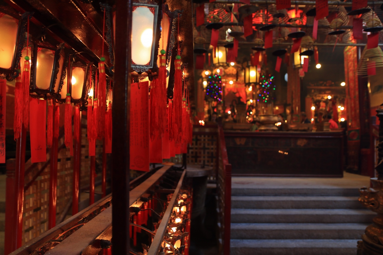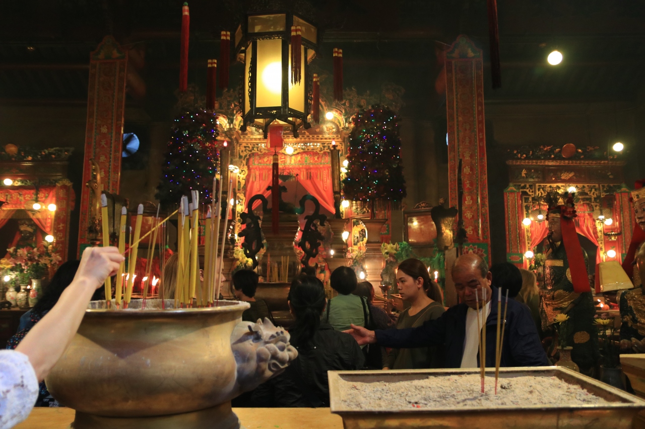 天井には渦巻線香が数多く並べられていて、廟内は煙で一杯です。その中を皆さんお参りしたり、占いをしていたりしました。