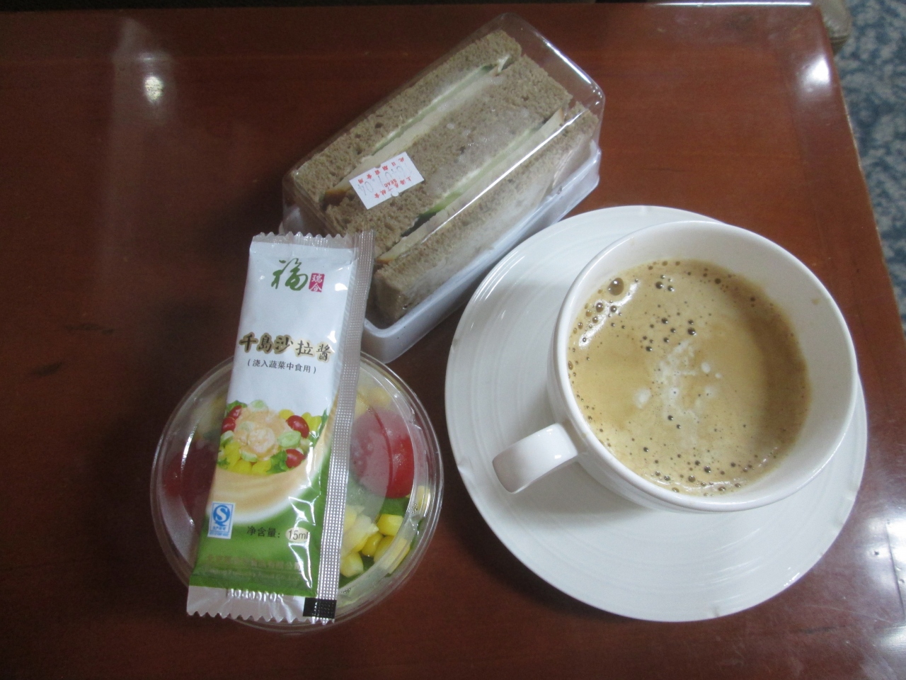 朝のJALサクララウンジを利用しました。世界的に標準的な朝食メニューに中国らしいおかゆや蒸しパンが提供されていました。当然、中国産でしょうが意外においしかったです。特に、ドレッシング付きのサラダがあったのが良かったです。
