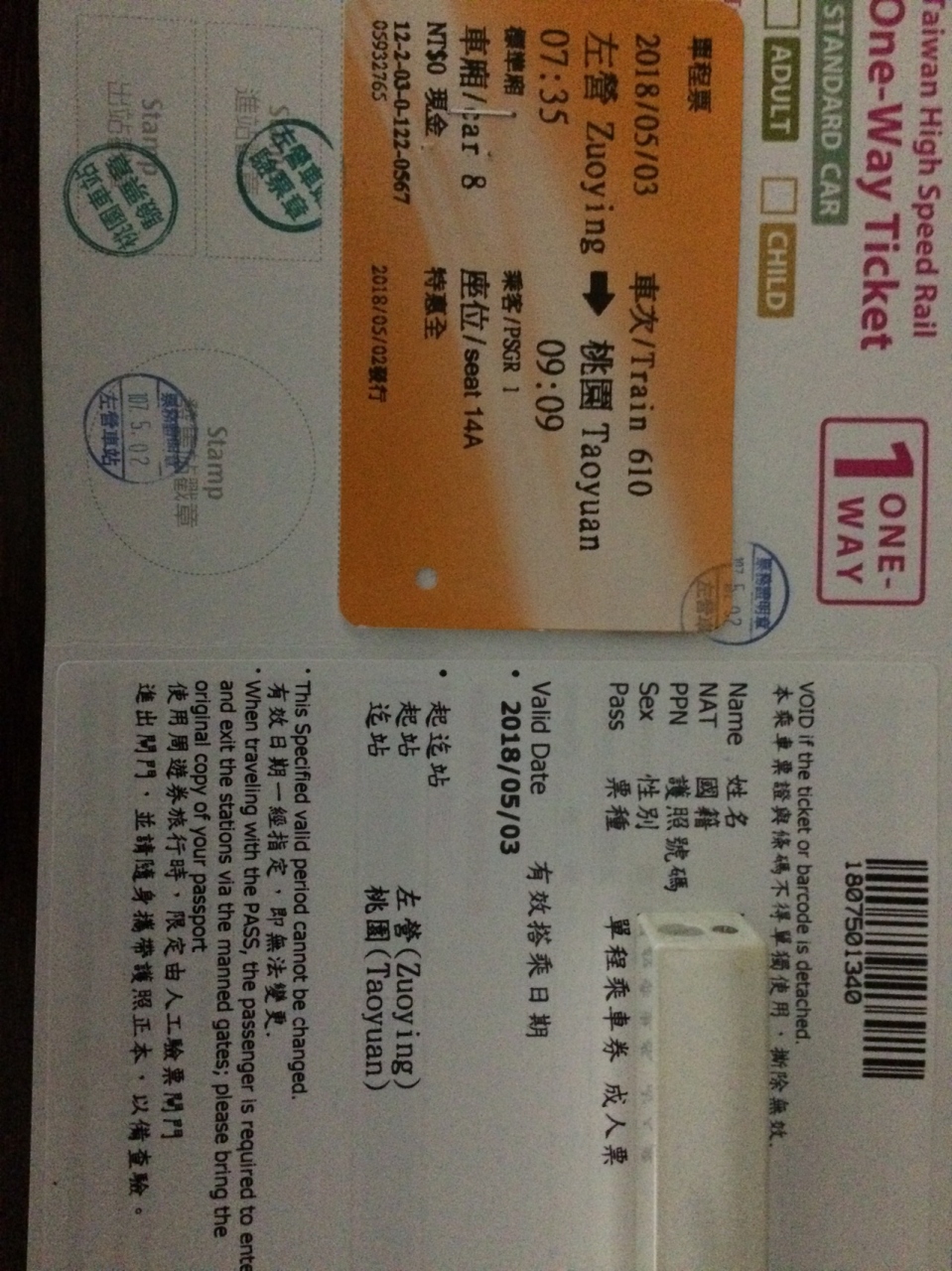 高雄左営から桃園まで外国人優待券を利用しました。日本でネット購入するとEチケットが発行されるので乗車前に窓口で優待券と引き換えます。その際無料で座席指定も出来ます。優待券は写真の紙の手帳に普通の高鐡の磁気カードがホチキスで留めてありますが、カードでは自動改札を通れません。有人窓口で駅員さんに声をかけ手帳にスタンプを押してもらって初めて通れます。