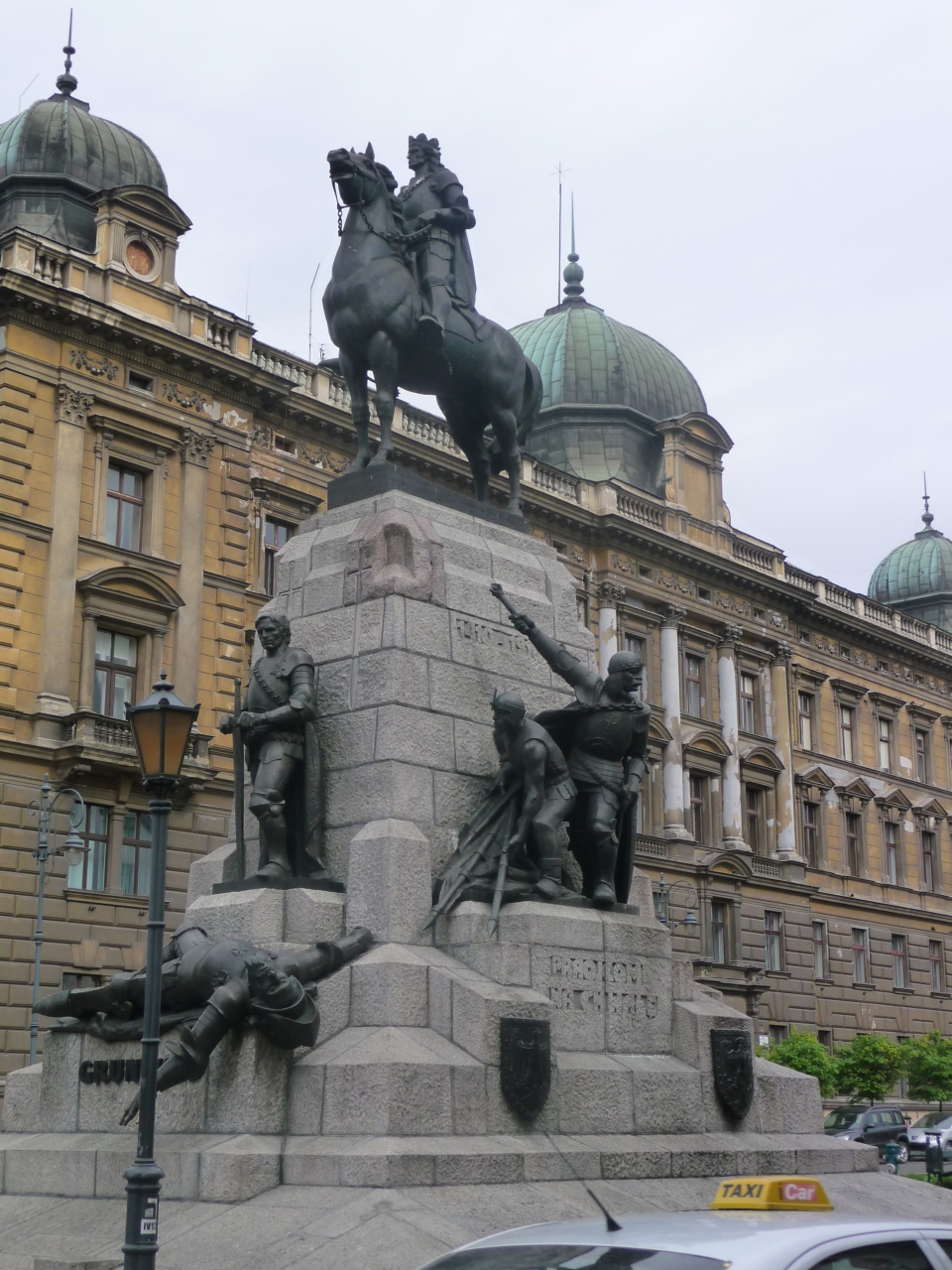 マティキ広場の中央に立つ巨大な像。勇ましい姿の騎馬象でグランヴォルドとは人名でしょうか? 何でもドイツ騎士団に勝利したポーランドの英雄の記念碑とか。台座の下部にはこの英雄を支えた仲間・部下らしき人達もいます。