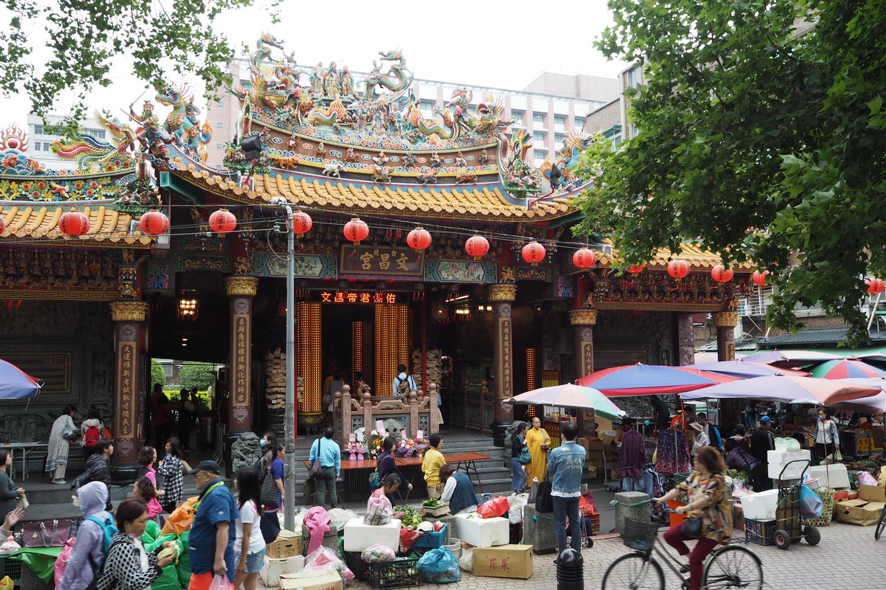 雙連駅前の雙連朝市のど真ん中にある宮です。市場に夢中になっていても大きくて立派なので目に入ってきます。なんとなく通り過ぎがちですが、中に入ると中華らしい雰囲気でとても綺麗です。学問の神様が祭られてるそうです。
