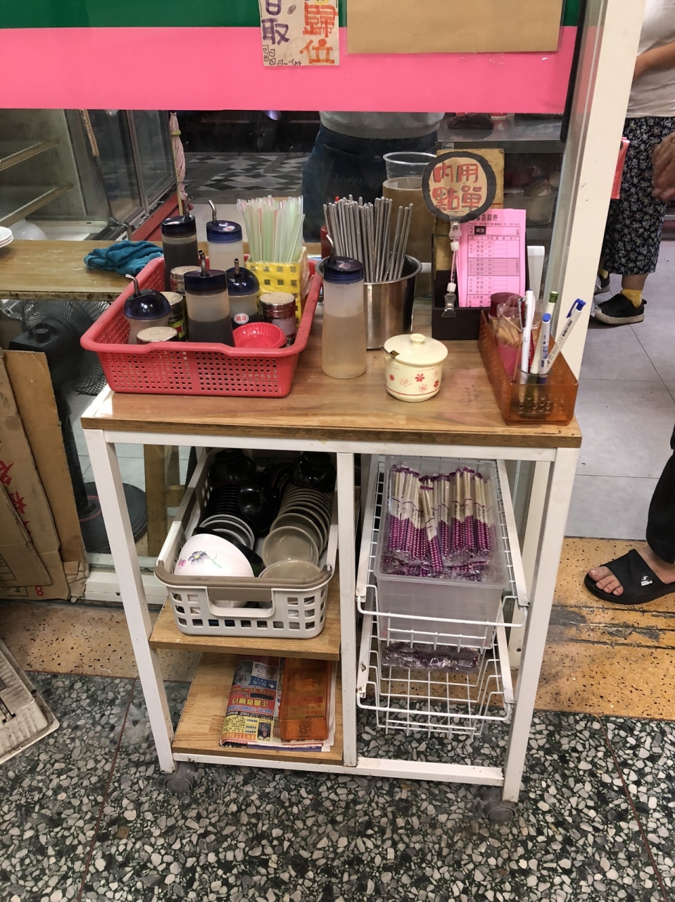 金属箸や小皿、ストロー、調味料などは入口のラックから自分で。