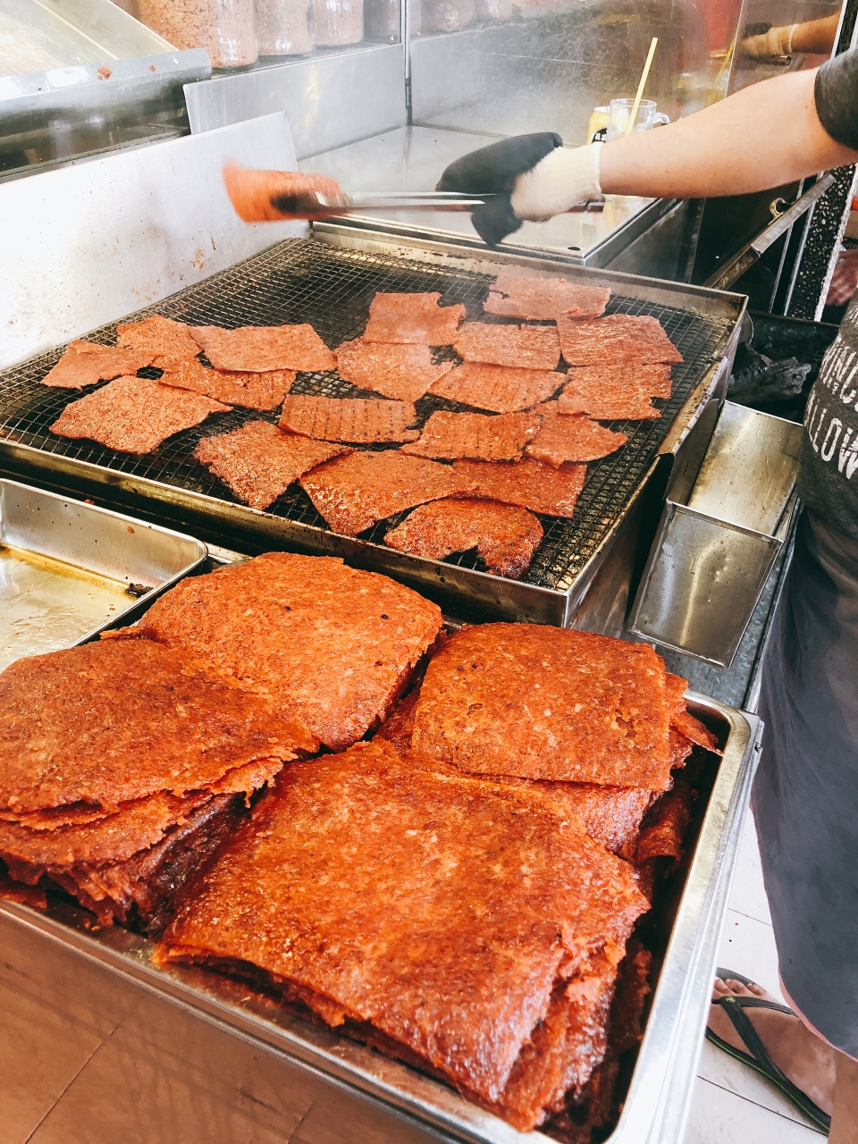 旧正月になるとシンガポール人がキロ単位で購入するバクワ(肉干)。地元シンガポールでは美珍香や林志源が有名ですが、個人的にはチャイナタウンのピープルズパークコンプレックスの1階に入っている金花源のバクワが好みです。旧正月が近づいてくると、早朝から総出でオニのようにバクワを焼いている様子に圧倒されます。私はいつもささやかに2枚ほどのバクワを5ドルで買って食べています。