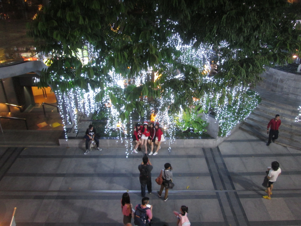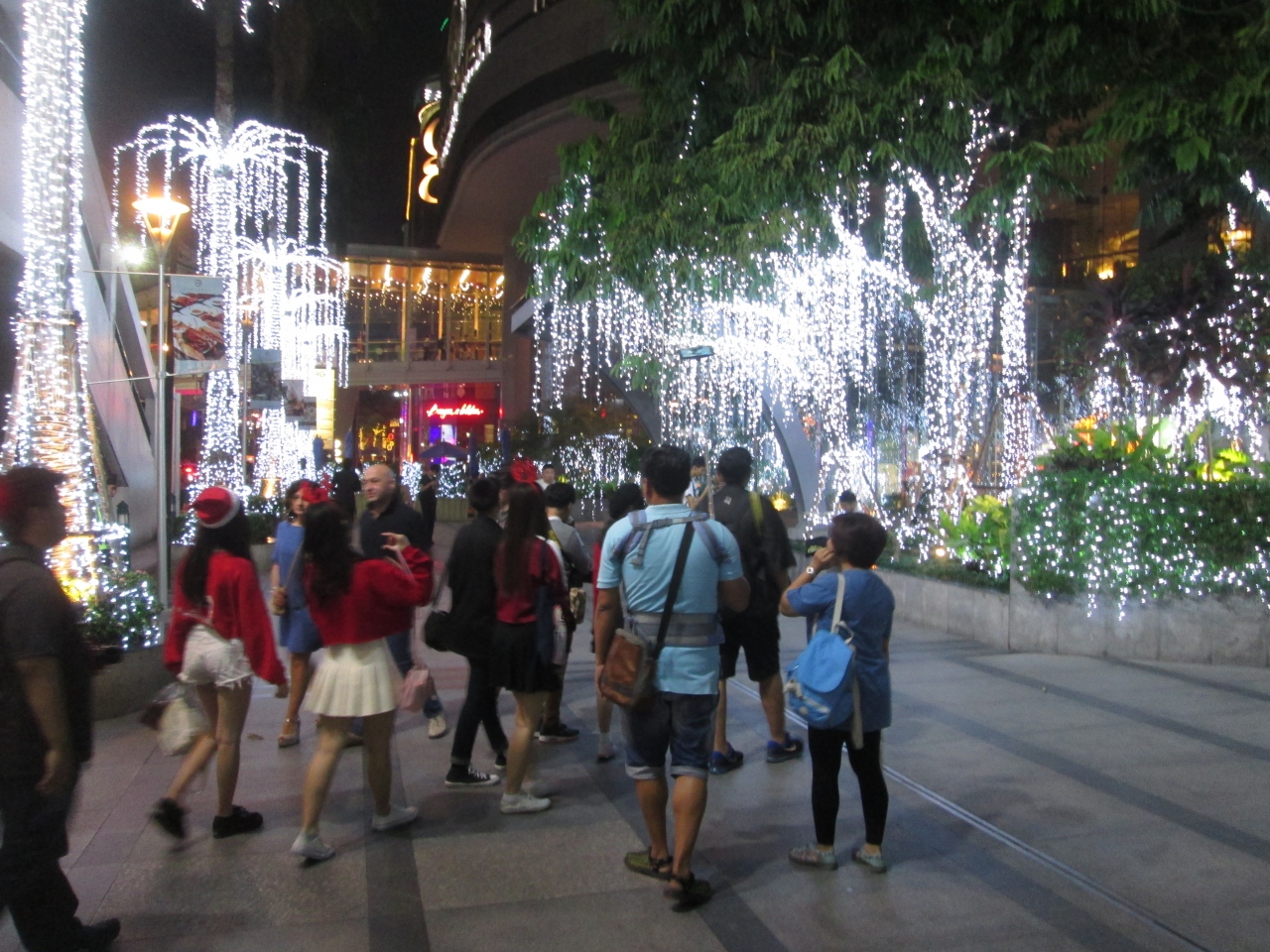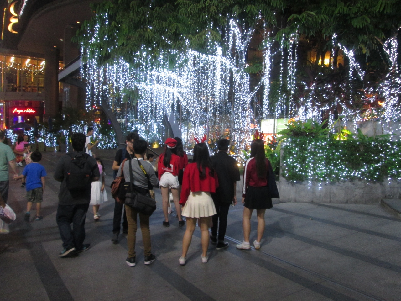 クリスマスの時期にプレジデントタワーに訪問しました。昨年のクリスマスはプミポン国王逝去直後のため自粛モードでしたが、10月末で喪が明け、きれいなイルミネーションを提供していました。プレジデントタワー前のイルミネーションは本当にきれいでした。クリスマスの衣装を着たモデルさんたちを使い撮影会を行っていました。
