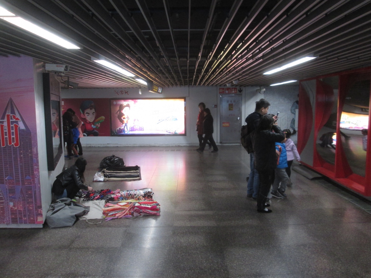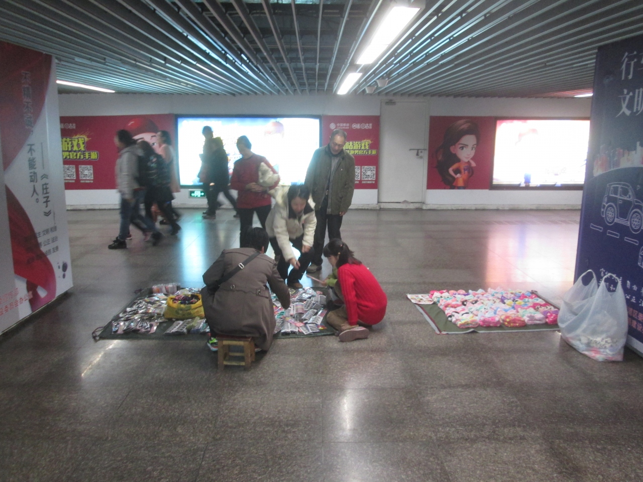 人民広場駅は地下道が多く迷路のようになっていました。地上は交通量が多く、信号待ちがながいので、この地下道を上手く使いこなせると、自分の目的地の出口に早く到着することができました。途中、露店があり品質的には怪しかったですが、安いアクセサリーや小物が売っていたのがおもしろかったです。