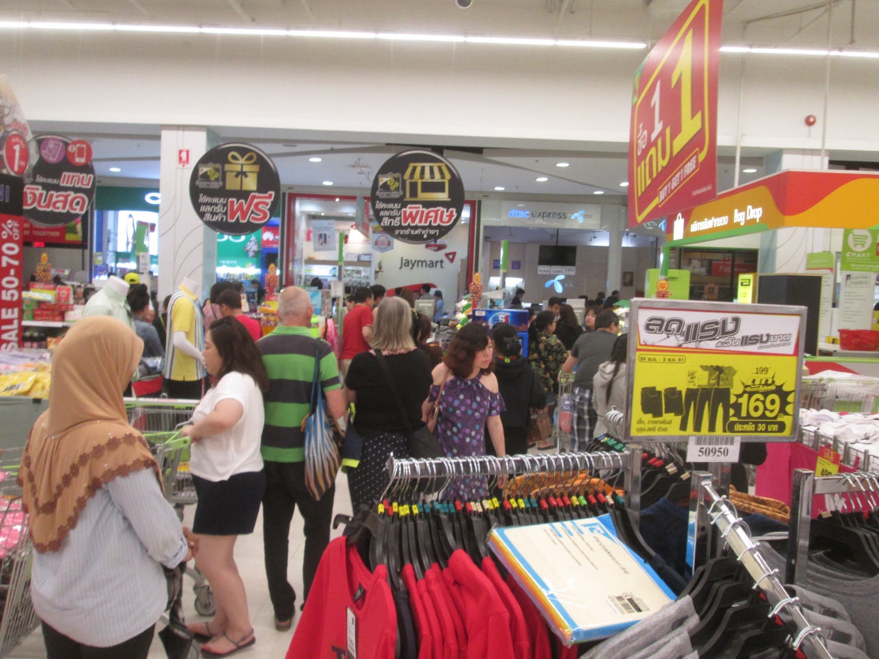 2018年のGWに訪問しました。4月現在、ビッグCラチャダムリ店は大規模な改装工事を行っており、入口付近はシートがかかっており閉店してようでしたが、ちゃんと営業しています。中に入るともの凄い人で、食料品、土産売場のレジ前には大行列ができていました。