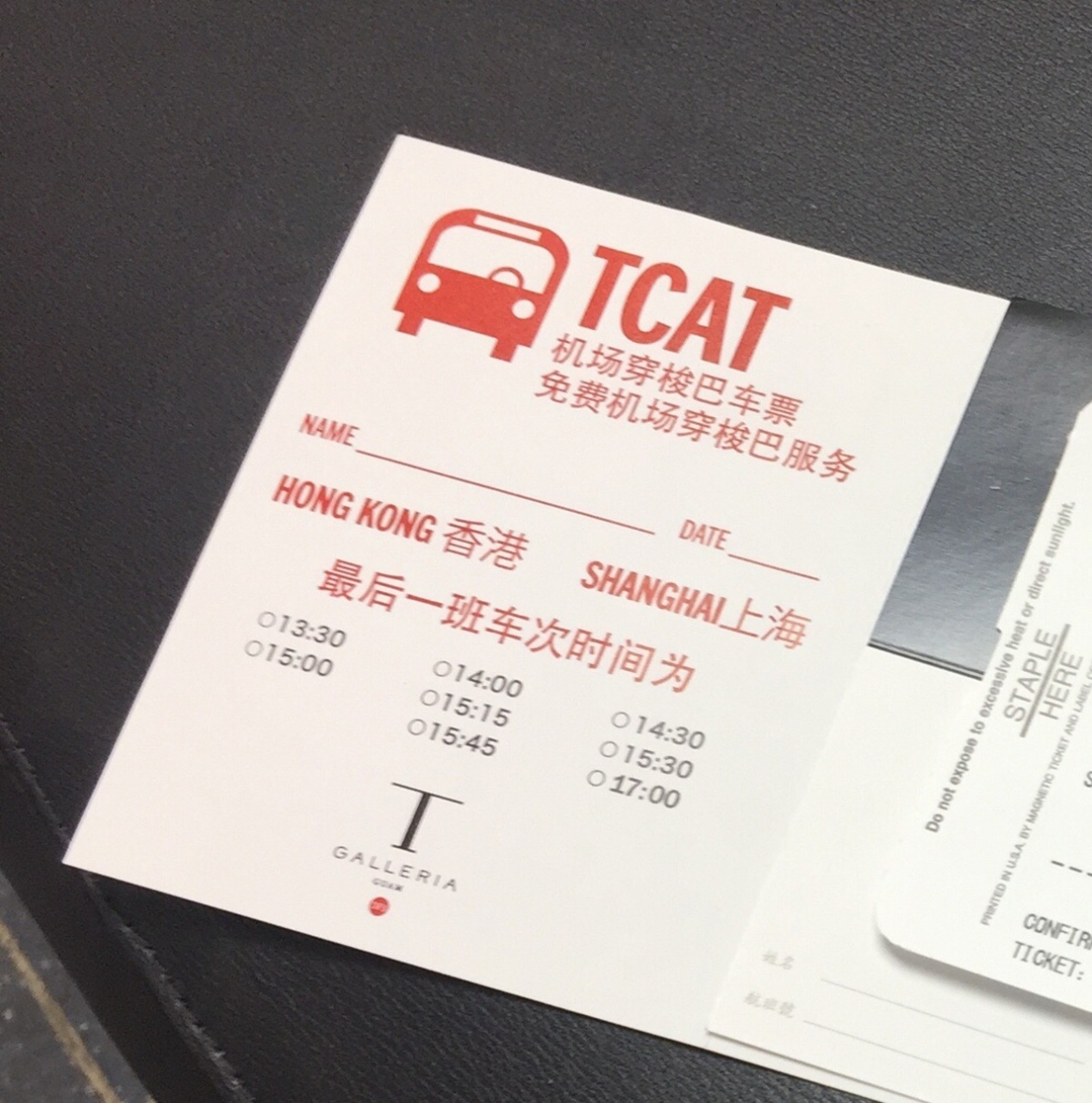 チケット売場で訊くと、航空会社はどこか?と、、、ユナイテッドと答えるとユナイテッド航空のチェックインカウンターに行くように言われました。チケットインをDFSギャラリア内で済ませたらグアム国際空港までの無料のバスチケットをくれました。ラッキーでした(^ ^)