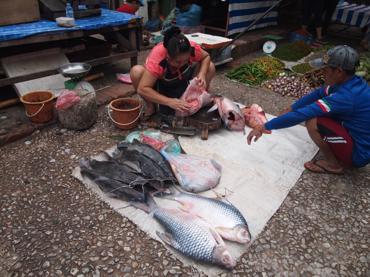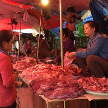 人々の生活を垣間見る興味深い市場。常温で売られる肉類や川魚などなど、見てるだけでも楽しい。