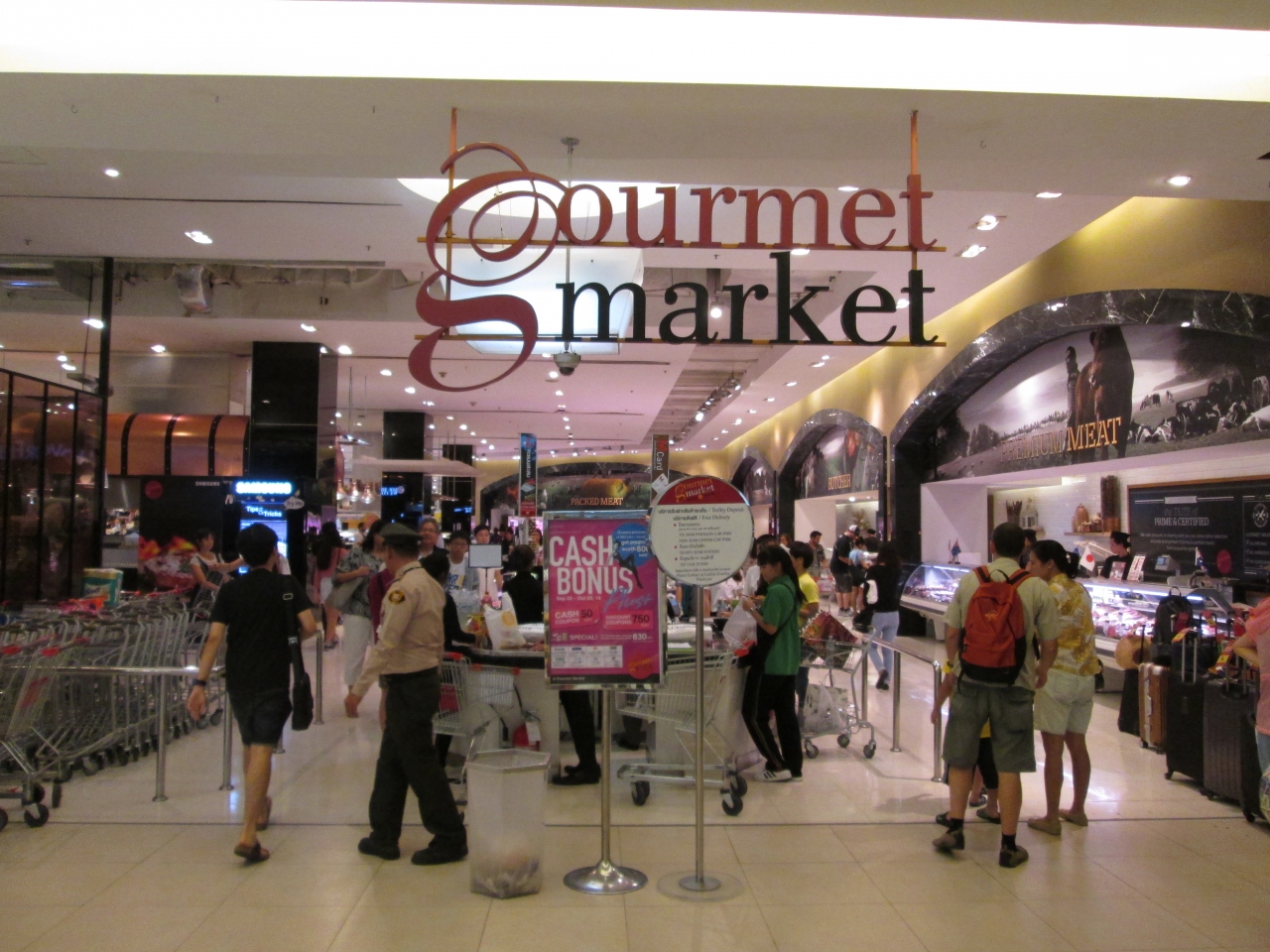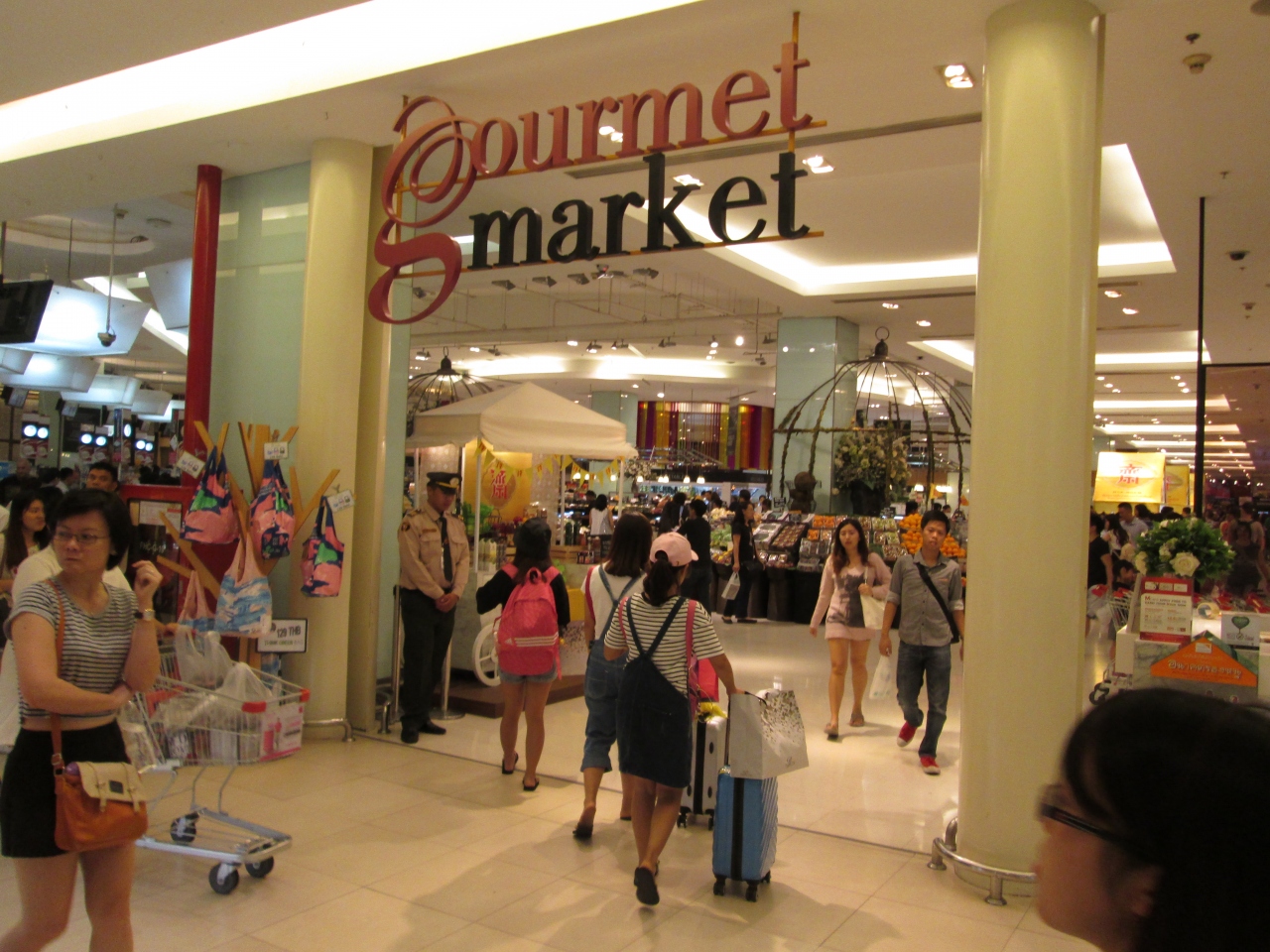 グルメマーケットの会計レジはいつも行列が出来ています。混雑してくると、スタッフを増員して、バーコードで読み取るレジ係と買い物袋に入れてくれるスタッフが2名で対応していました。思っていたより、時間がかからずスムーズな会計処理でした。
