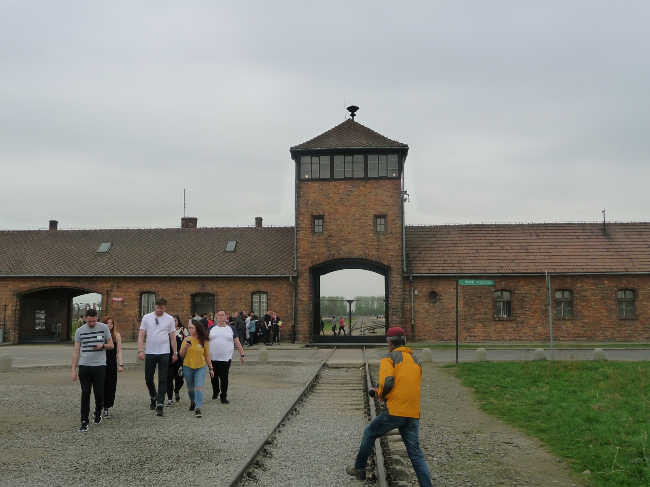 入り口に、「死の門」といわれるゲートがあり、門手前の遠方から門内側に向かい一直線の鉄道線路が走る。何十万という人達が貨車輸送された名残りである。