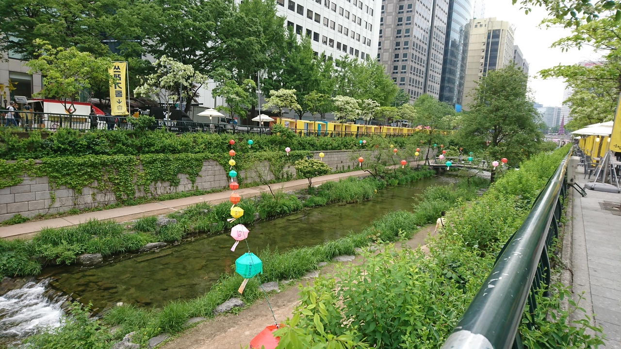 天気がいい時には明洞から広蔵市場などに歩く時などに通ったりして、その時についでに川沿いに降りたりしますが、今回は明洞から曹渓寺に行く時にとおりました。提灯祭りの飾りつけで提灯が飾られていました。陽気がいいせいか日曜日には川沿いはフードトラックがいっぱいでていたので美味しいものを見つけてもいいかな。