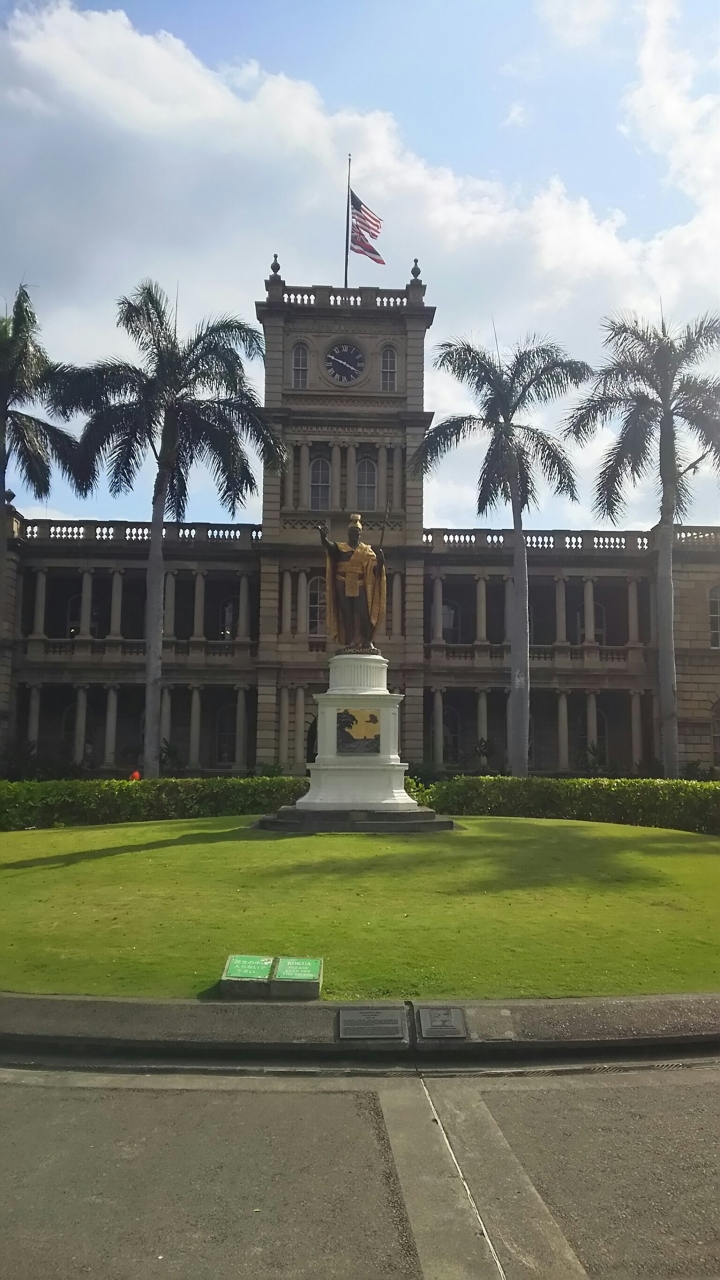 訪れた時間的にイオラニ宮殿には入れなかったのですが、カメハメハ大王像の前で写真を取っただけでも満足できます。