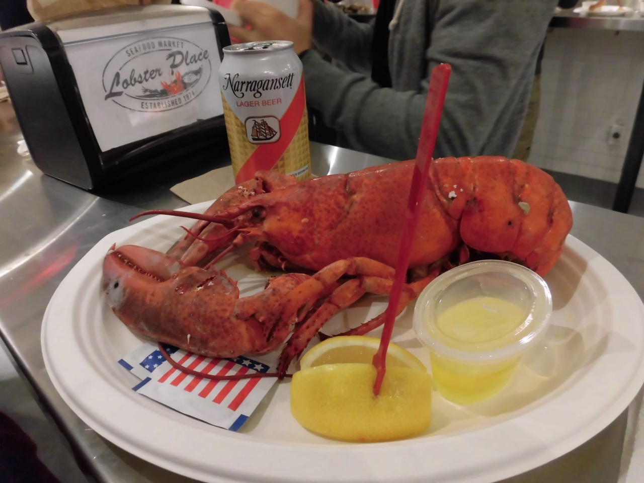 ロブスターはS,M、Lサイズで、注文、会計をして番号を呼ばれるのを待ちます。 でも英語で呼ばれるのがわからないので、なんとなく検討をつけて行き、レシートに書かれた番号を見せて受け取りました。 この時、レシートを渡してしまうので値段はいくらだったかな。 確か税金入れて37ドル位かと。 Sサイズです。