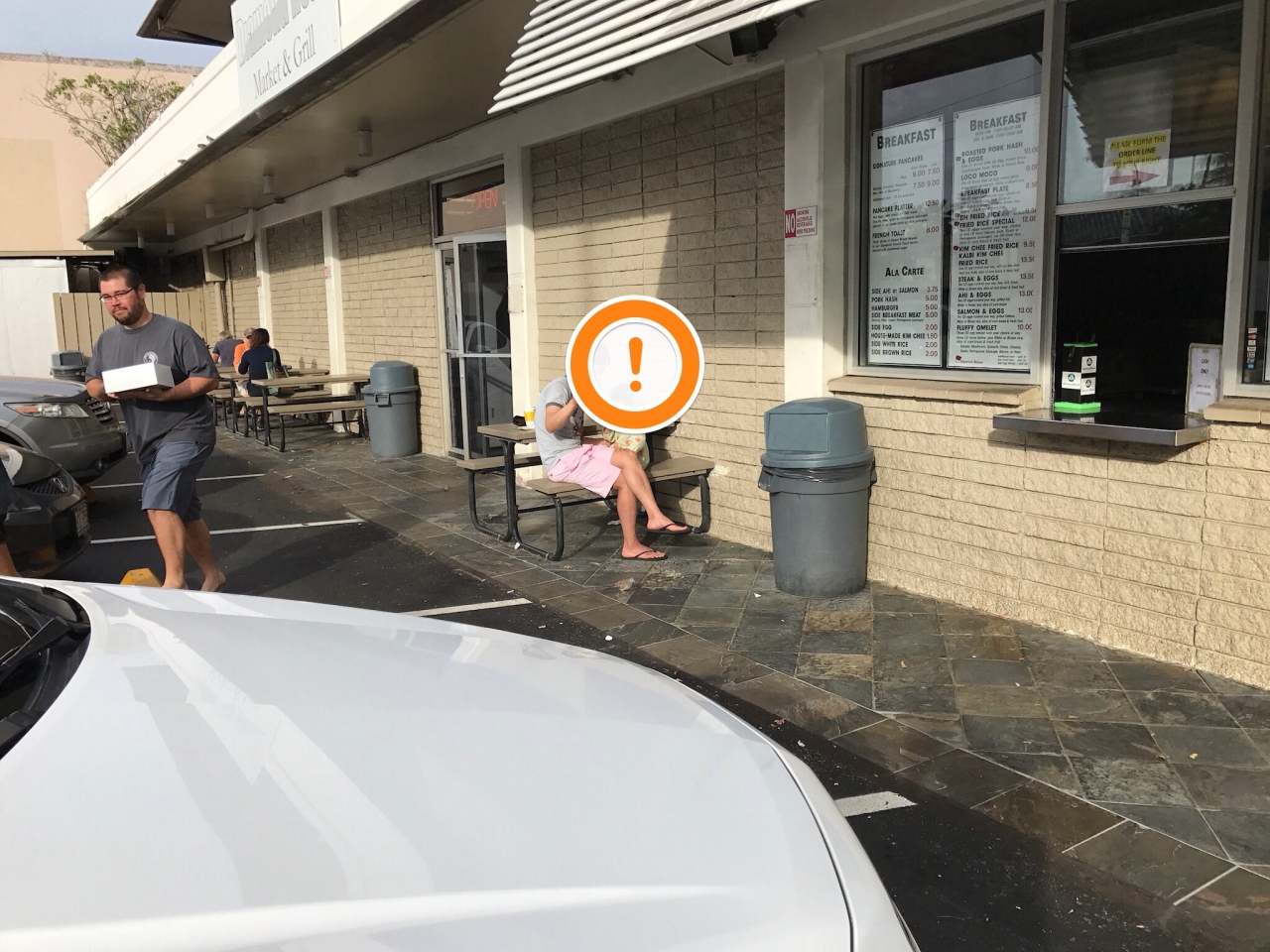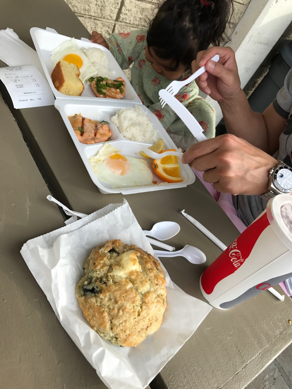 旦那は外の窓口で、サーモン&エッグプレートを注文していました。朝食なのに13ドルです 汗