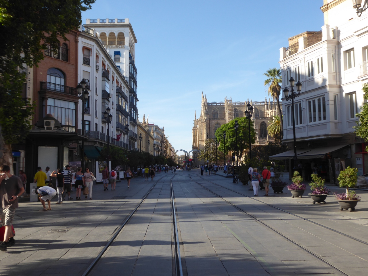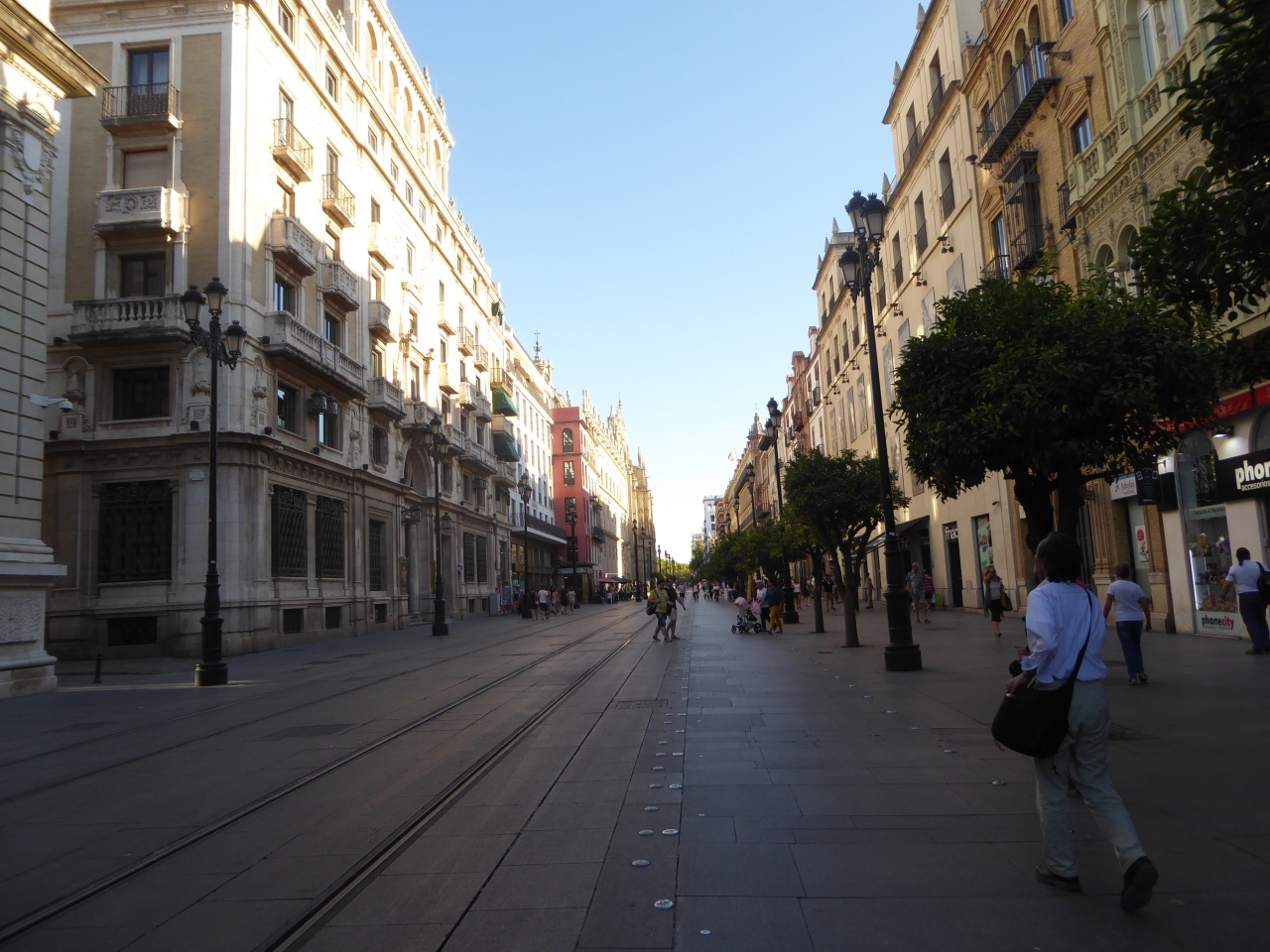 セビリア大聖堂の西側を通る大通りで、複線のトラムが走っていました。通り沿いには沢山のショップやレストランがあり、大聖堂とアルカサルの間にセビリアのビジターセンターもありました。旧市街にある観光スポットを訪問するときに利用する通りで、我々もこの通りを何度も往復しました。日が沈んで涼しくなってから、通りの両側に建つ歴史を感じさせる建物やショップを見物しながら散策すると楽しいと思います。