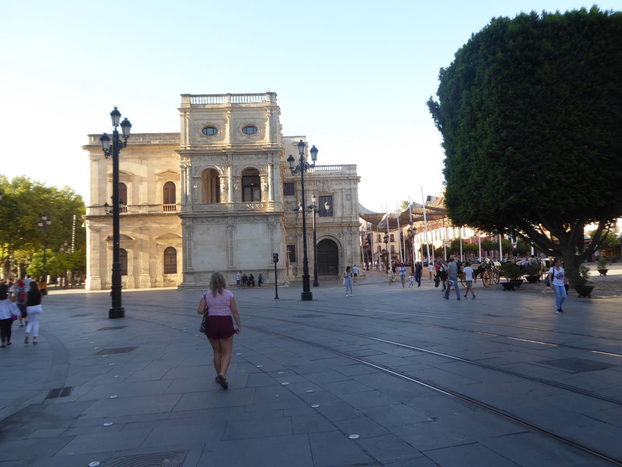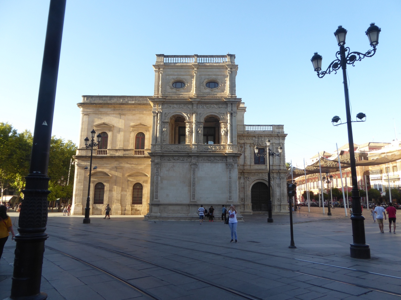 セビリア大聖堂の横を通っている通りにはトラムが走っています。このトラムを何度か利用した時に、路線の延長上にある由緒ありそうな建造物が気になりました。調べてみるとセビリア市庁舎でした。トラムの停留所付近は広場になっており、沢山の人がいました。市庁舎西側のヌエバ広場は、樹木が多くて木陰もあり、広々としています。夕暮れ時に散歩するのも楽しいと思います。市庁舎の反対側にも細長い広場がありました。これら広場は町のイベント会場になっています。