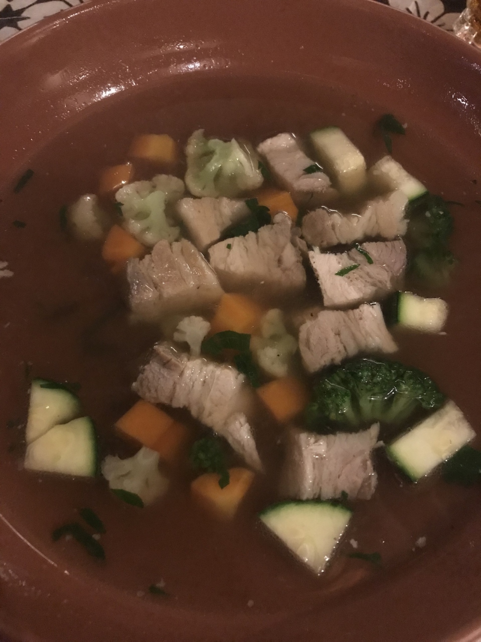 なので、ポークとベジタブルスープという、地味な食事となりました。