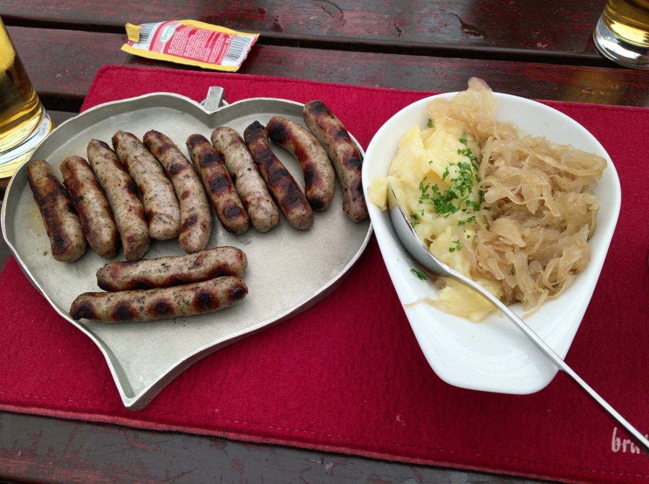 ドイツでミュンヘンの白ソーセージと共に楽しみにしていたのが香味料の効いた小ぶりなニュールンベルクソーセージ。有名なレストランを下調べして行きました。テラス席でビールを飲みながらのソーセージは最高!ザワークラウトと共に何皿でもおかわりできそうな位です。