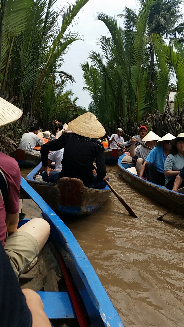 到着したと思えば、メコン川の中州へボート移動、、、いろんな土産物やを経由しつつ、メインの手漕ぎボートと思えば、、、中国系の団体客で大混雑、、、単に船に乗って、狭い水路を移動するだけ、、、