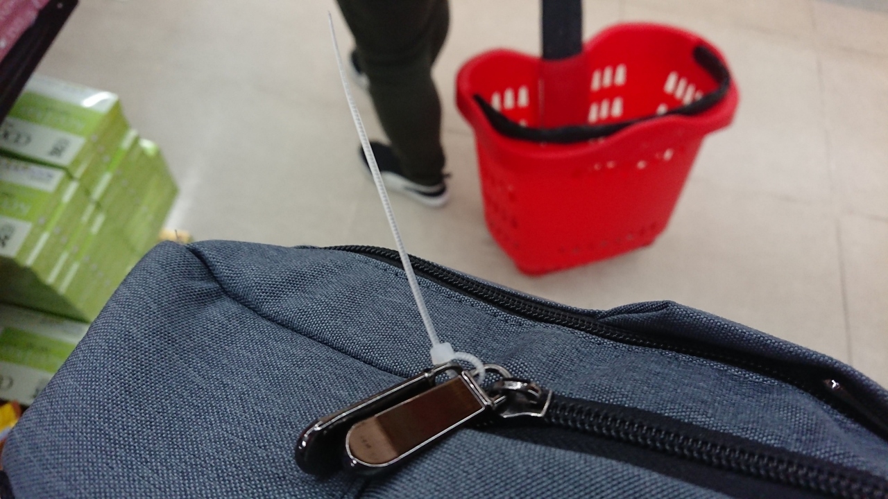スーパーマーケットに入るとき、ボディバッグを持っていたら結束バンドで口を閉じられました。万引き防止のためと思われます。