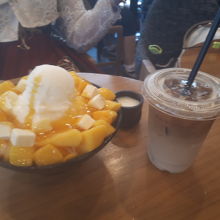 タルギピンス(苺のかき氷)を食べに行きましたがやっぱり売り切れでした。イチゴは季節限定なのでどこに行っても人気です。月曜日の昼なので、ほぼ満席でしたがちょうど出る人がいてすぐに座れ、マンゴーピンスを注文。白いシロップが練乳かと思いきやヨーグルトソースで甘すぎずさっぱりした味で美味しかったです。