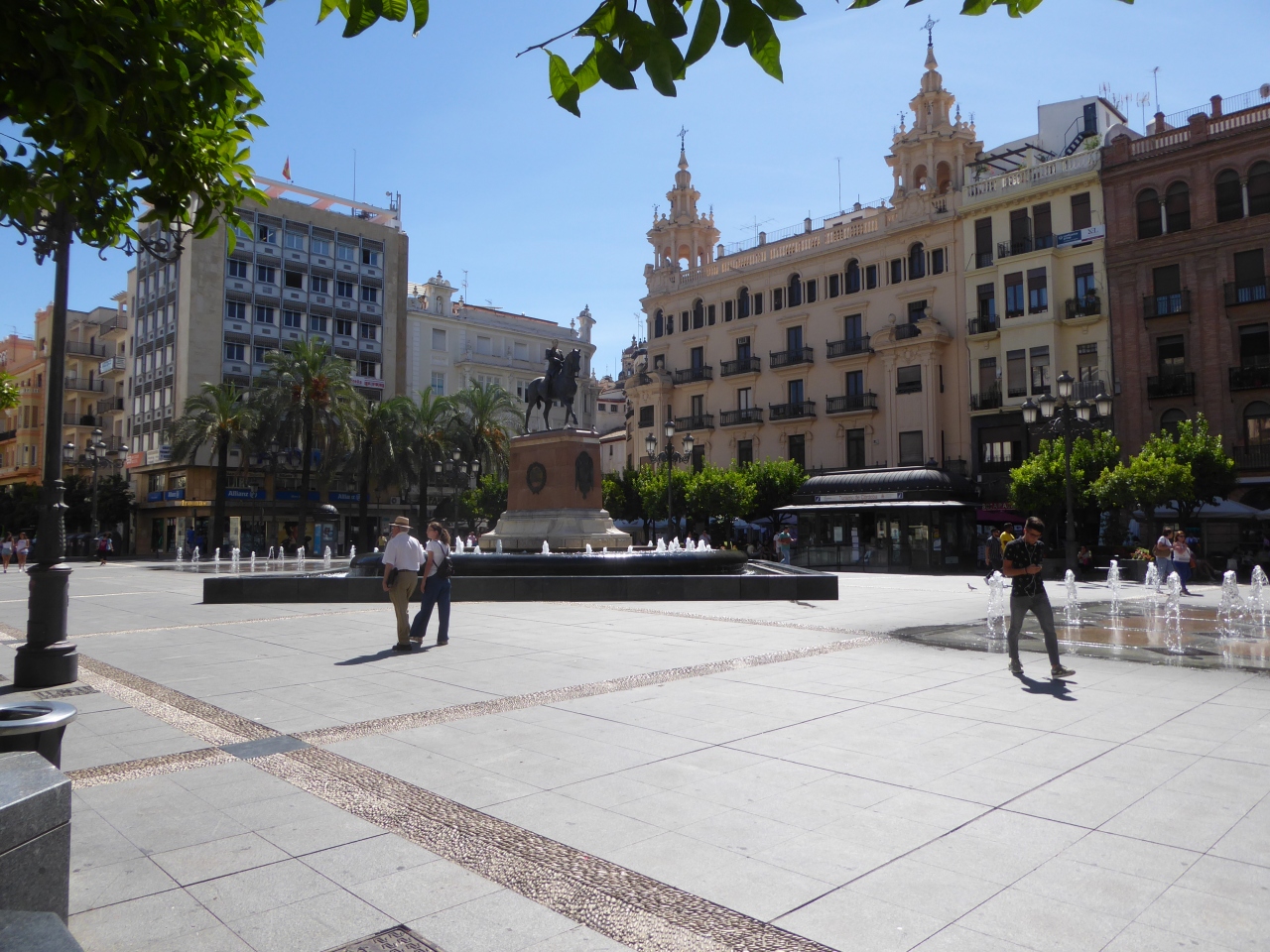旧市街からコルドバ駅に向かう途中にこの広場を通りました。広場周囲には、コルドバでは比較的高いビルが建っており、ショップに加えてビジネスオフィスなどもありました。この広場がある場所は、旧市街に近いビジネス地区の印象です。広場の中央には騎馬像が立ち、その前に路上から噴き上げる沢山の噴水がありました。9月初旬の暑い日中で広場には強い日差しが照り付けていましたが、噴水があるため涼しげな感じでした。