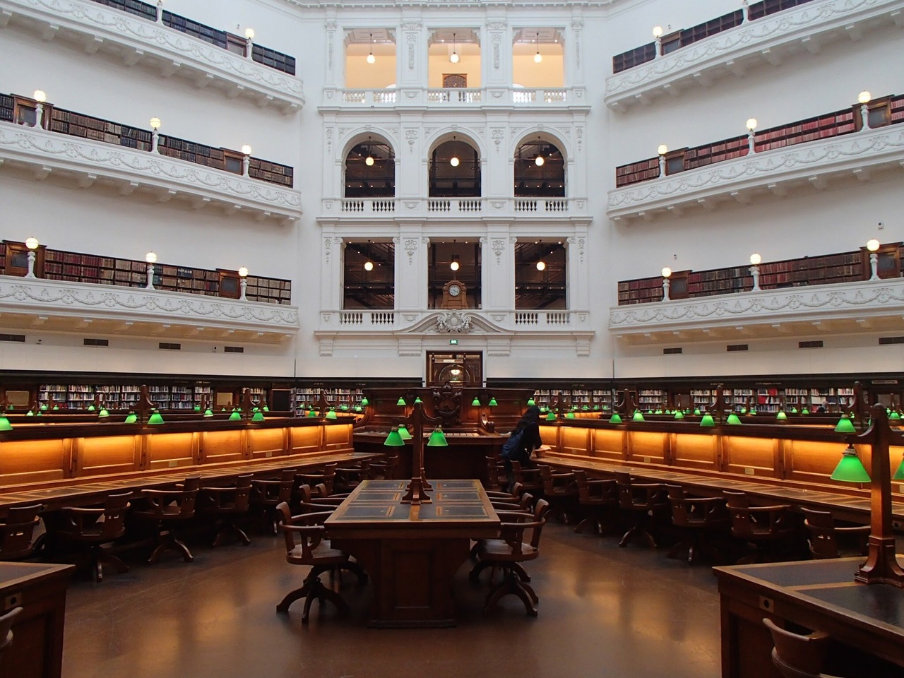 トラムでメルボルンセントラル駅まで行くとすぐ近くにあります。入場料は無料です。ガイドブックに乗っていた放射線状に配置された座席のある吹き抜けの部屋から見学しました。机に向かって勉強している人も居ました。机に向かっているさまを写真に撮っている観光客も。(私もその内の一人です。)