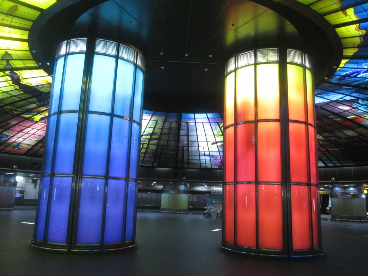 地下鉄美麗島の地上から地下鉄の駅の方へ階段を下りると、構内中央に光之穹頂が見えてきました。光のドームは、2本の赤、青の柱を支柱として、ドーム型にステンドグラスが輝く場所でした。とてもきれいな光景で、世界でもっとも美しい駅の2位に選ばれた理由が分かりました。