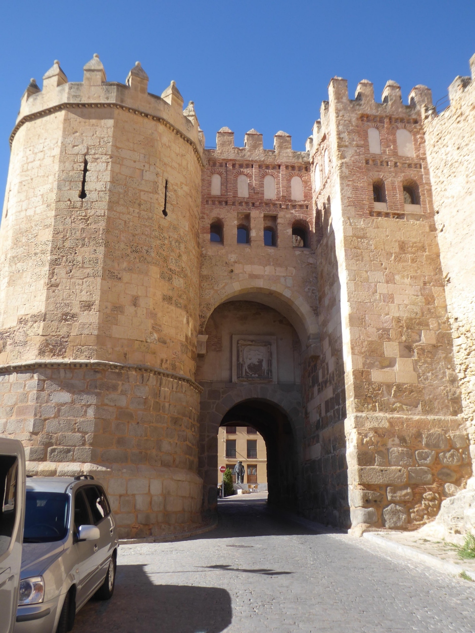 セゴビアバスターミナルを出発点にしてアルカサルに向かいました。約1km程の距離で、坂道を登ります。途中にこの門がありました。城壁の一部になっている石造りの頑強な門です。この門を通過して更に坂を登ると、城壁の上部に出ました。セゴビア旧市街の主要部は丘の上にあり、バスターミナルから標高差は約100mです。城壁の上から300m程先の前方にアルカサルが見えます。(4Travelの地図情報は間違っていますので、注意下さい)