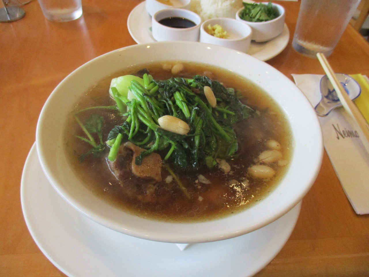 二人で訪れてオックステールスープとシュリンプ・ソバ・サラダ(各18ドル)を頼み、シェアして食べました。